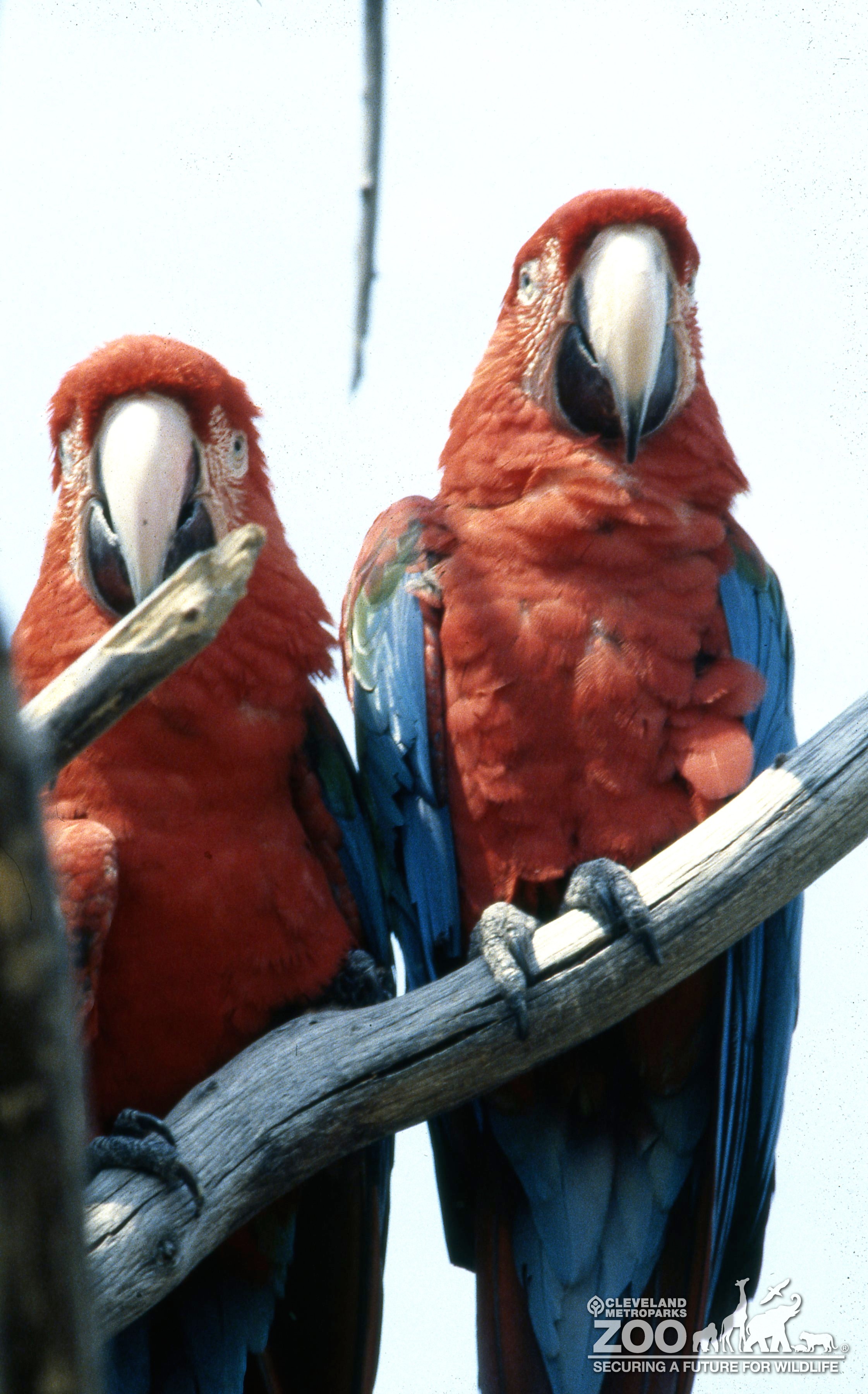 Close up photo of two Scarlet Macaws sitting on a branch.