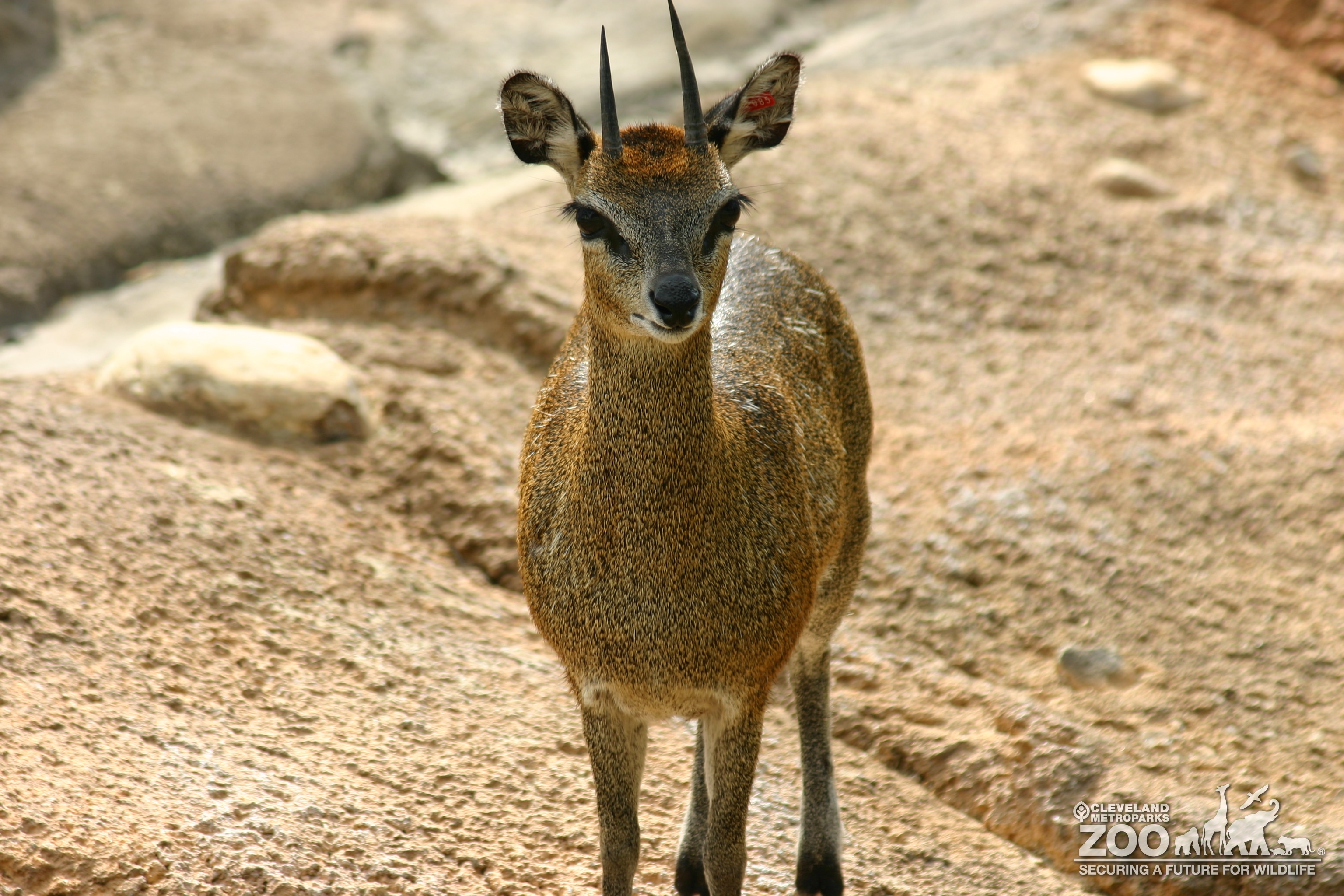 Klipspringer on monkey island facing forward. Animal has large dark eyes and pointy antlers. Its hooves help it climb.