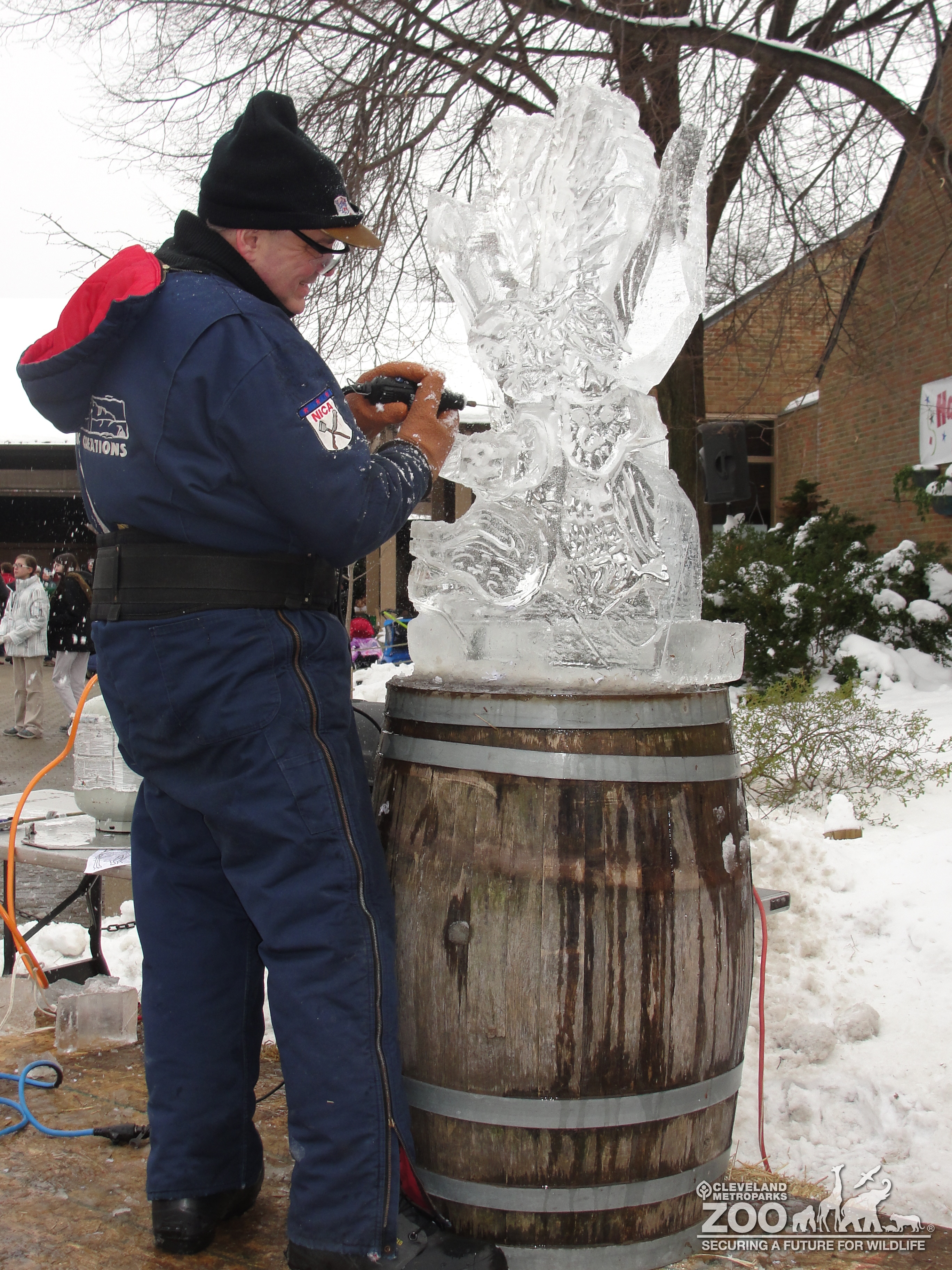 Photo shows individual working on Ice Sculpture for Noon Year's Eve event.