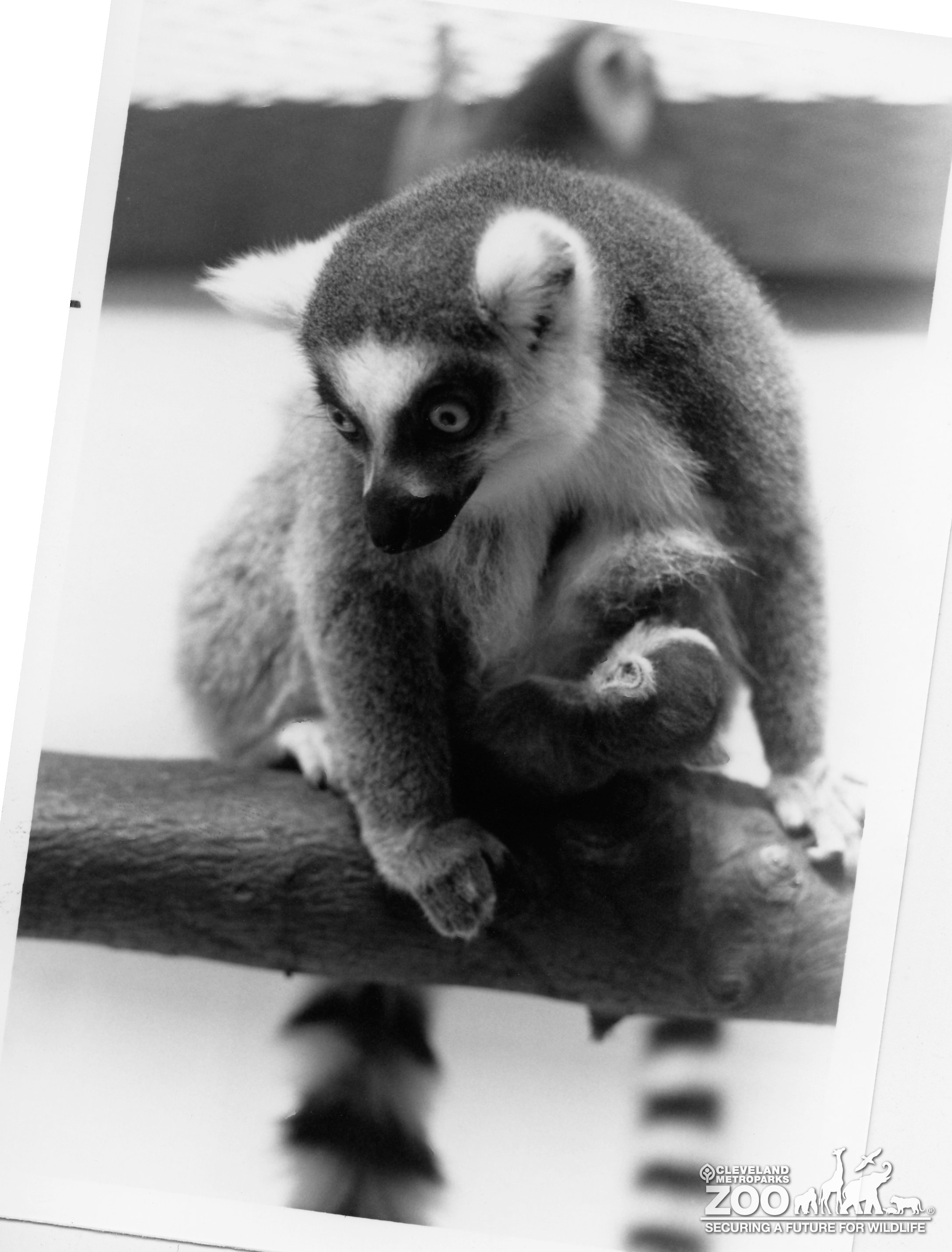 Black & white image of mother and baby ring-tailed lemur. She is sitting on a branch while the baby clings to her chest.