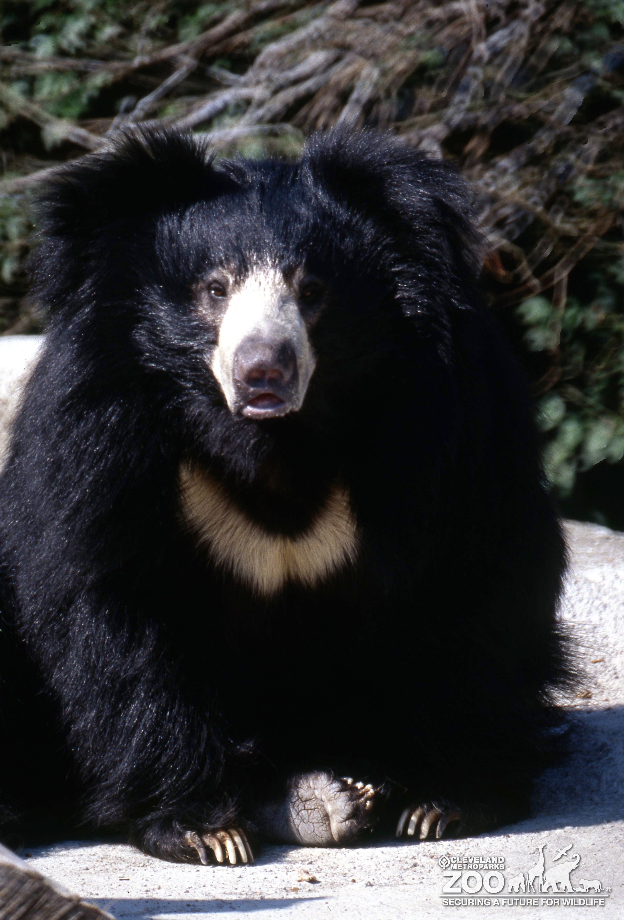 The Sloth Bear is sitting in its outdoor enclosure looking at the camera. It is sitting out in the sun on grey rocky ground. The bear is covered long black fur with light grey fur on its muzzle and a stripe in the shape of a v on its chest.