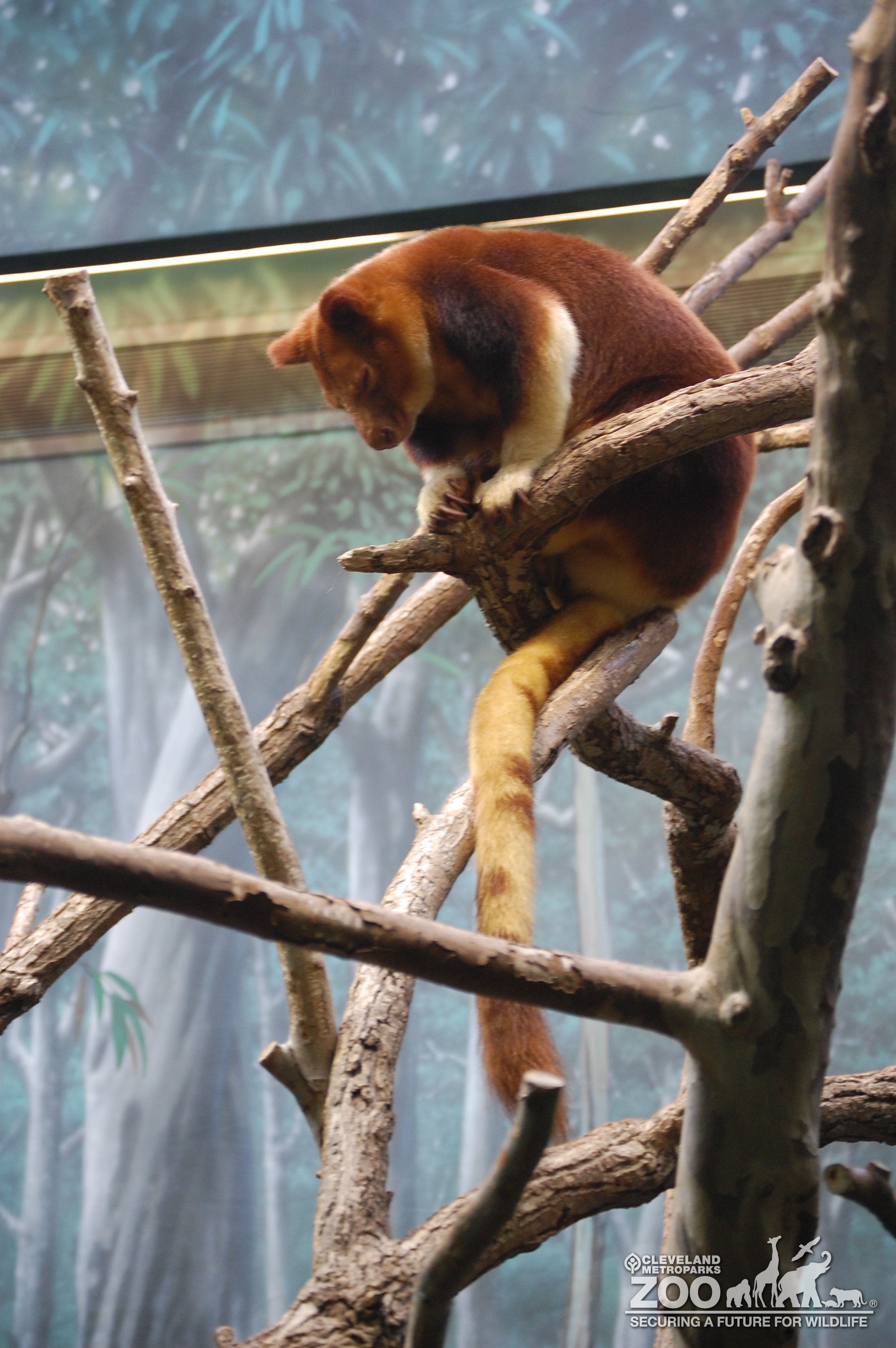 Tree Kangaroo in shades of red, brown, and white sitting in tree branches with eyes closed and facing the left. Long white and brown tail hangs down below the tree kangaroo in the branches.