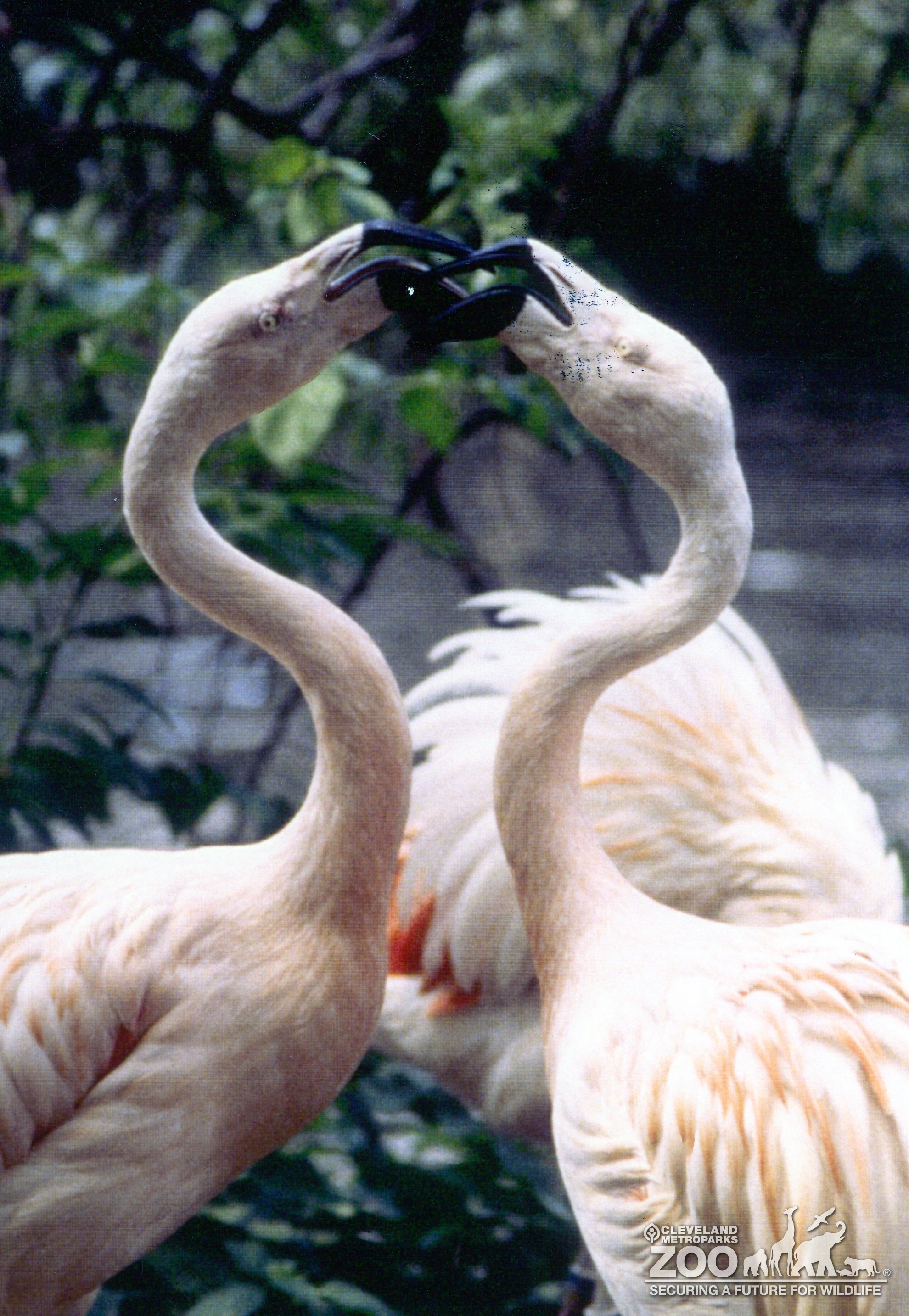 Two Chilean flamingos in shades of white and pink facing one another with necks curved upward and black beaks open and interacting with one another.
