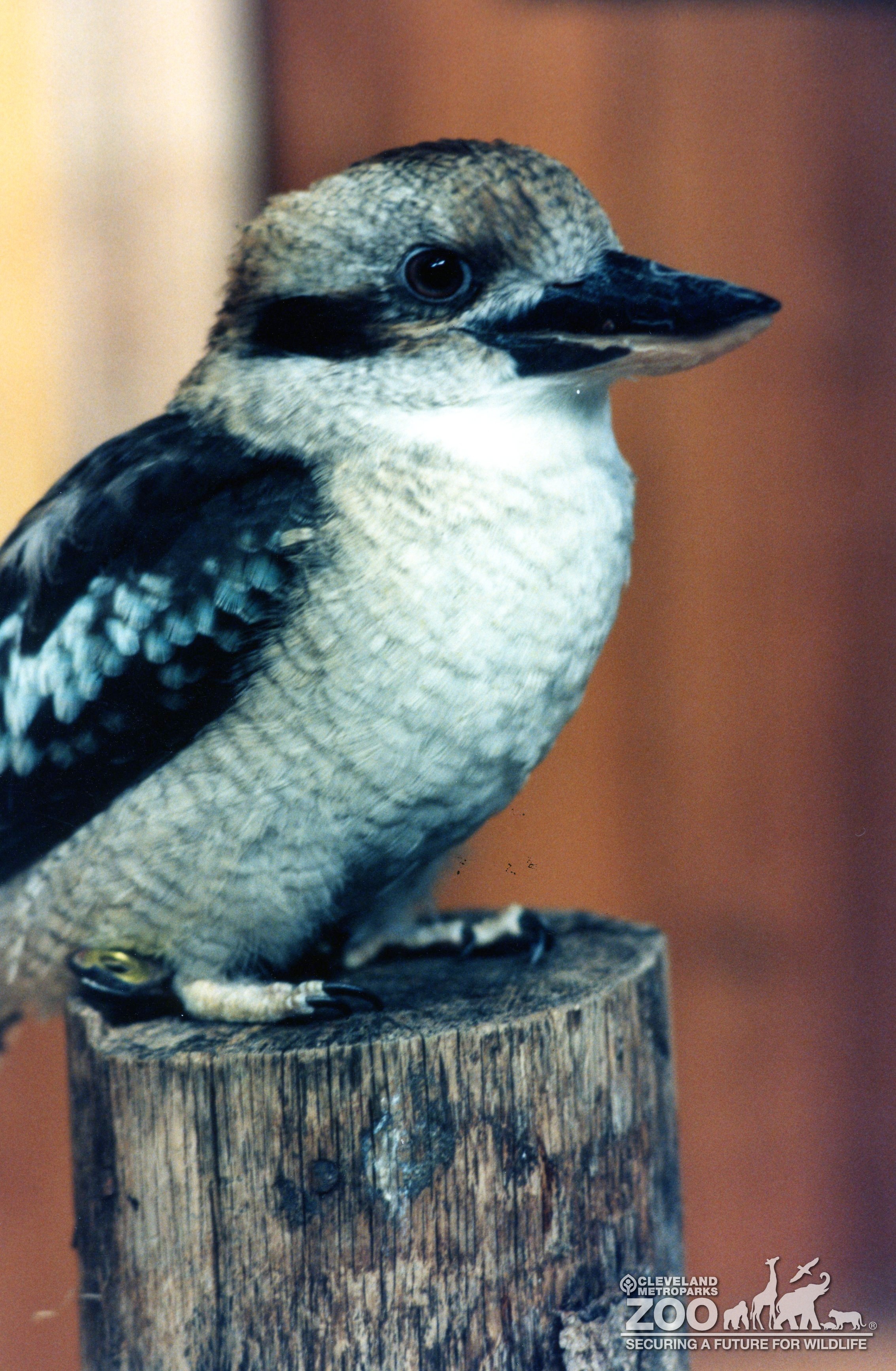 Closer view of kookaburra standing on a wood post. The sturdy bird is seen in profile. Feathers are shades of black, brown and white.
