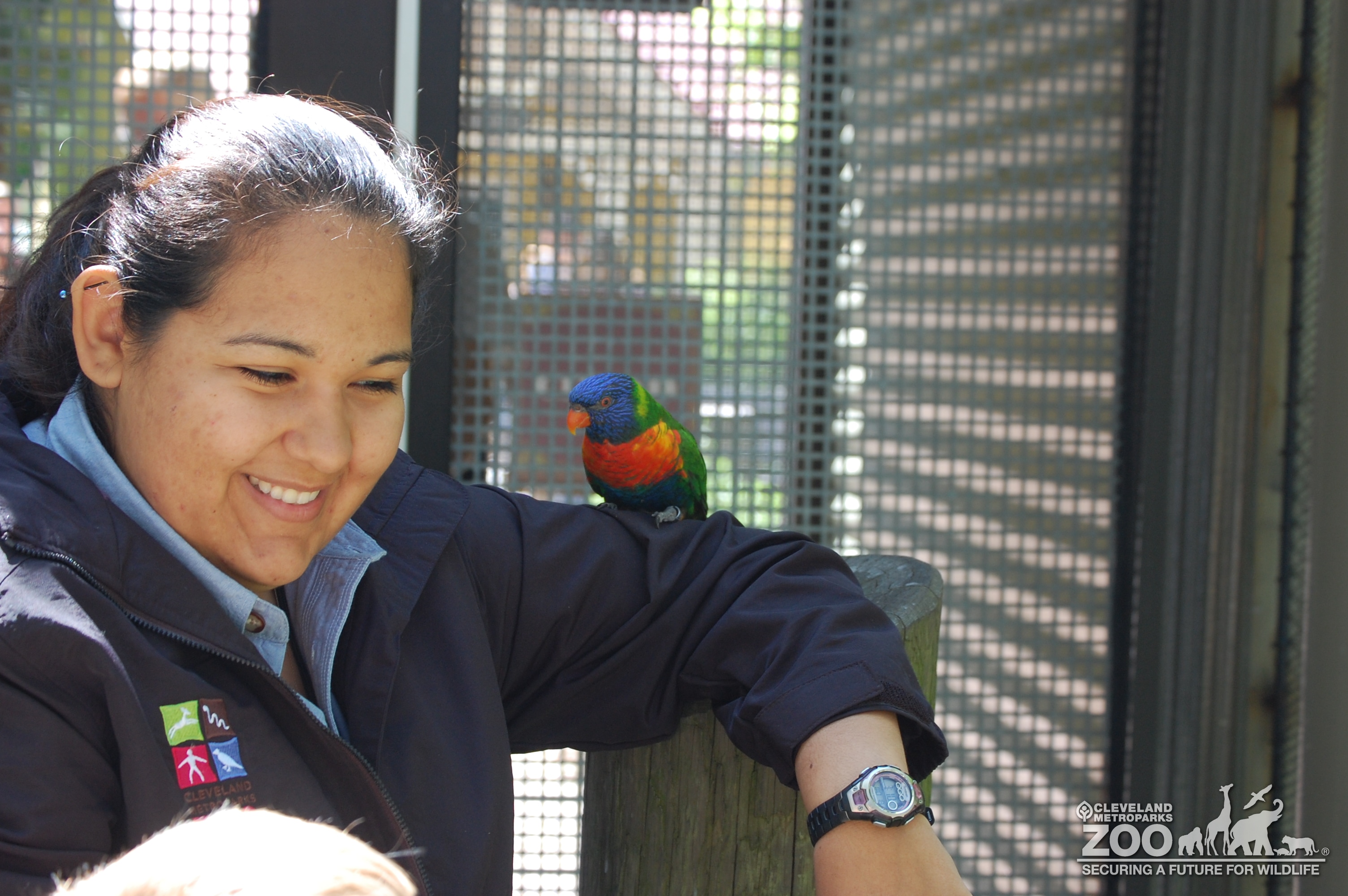Antoinette Rivera, education interpreter, with a lorikeet on her arm. They are in Lorikeet Landing in Australian Adventure. Lorikeets have bright colored feathers.