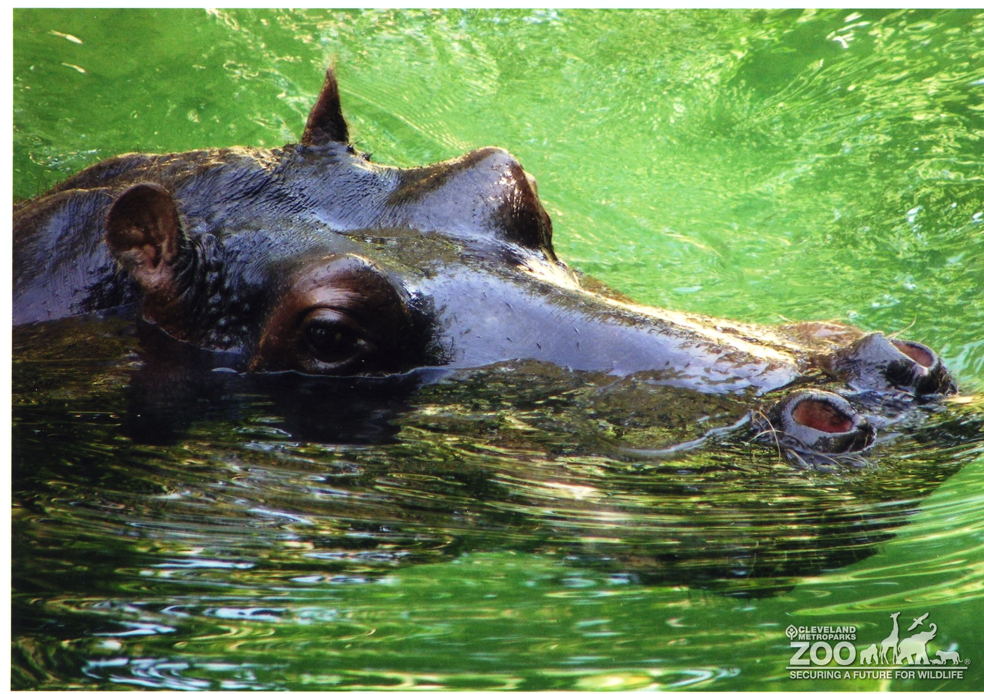 Nile hippo, Blackie, swimming in pool. Just his eyes, ears and nostrils are above the clear water.