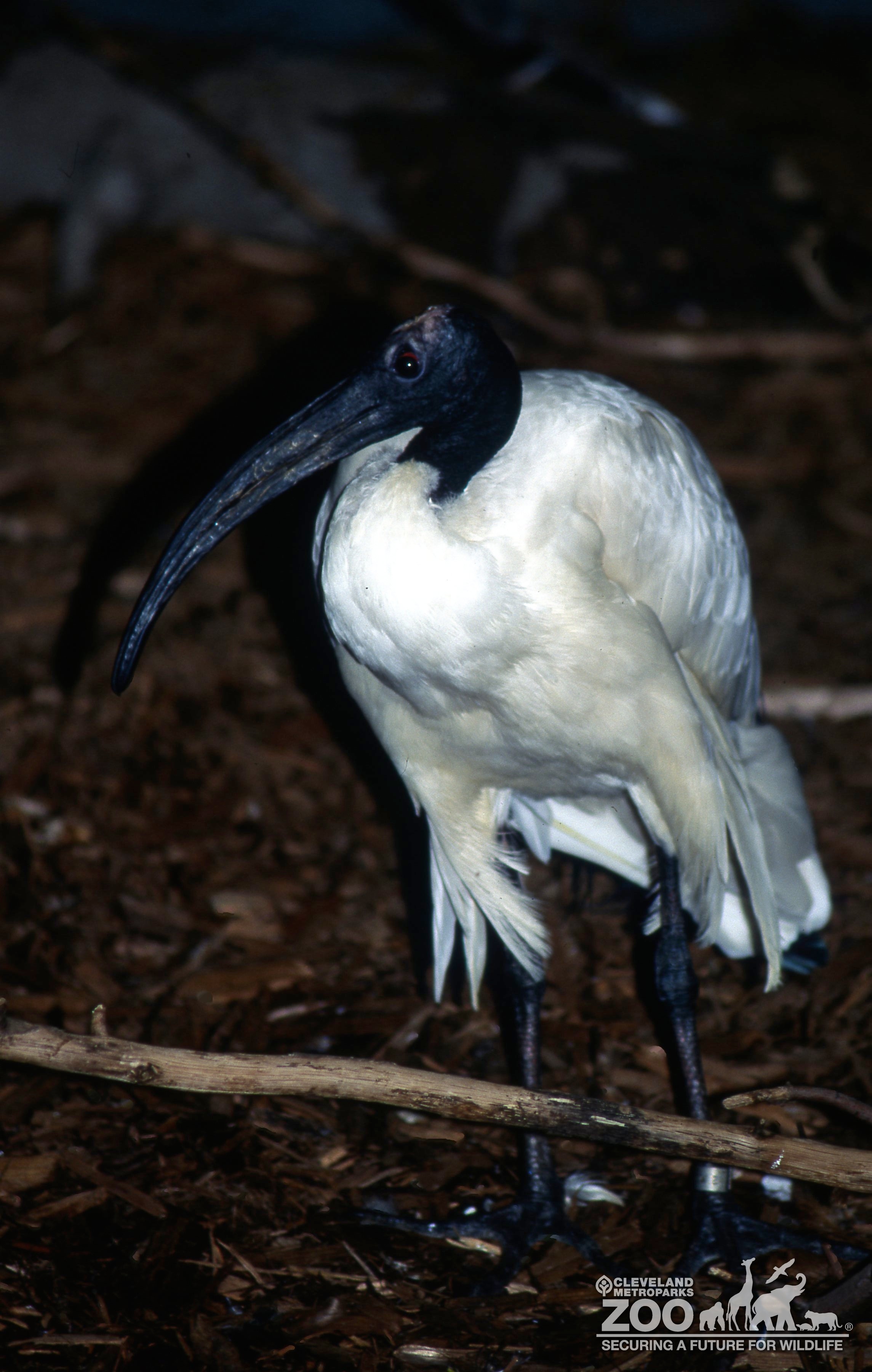 Sacred ibis close-up. Its is facing to the left. Long narrow bill is black and body feathers mostly white. Mulch is on the ground.