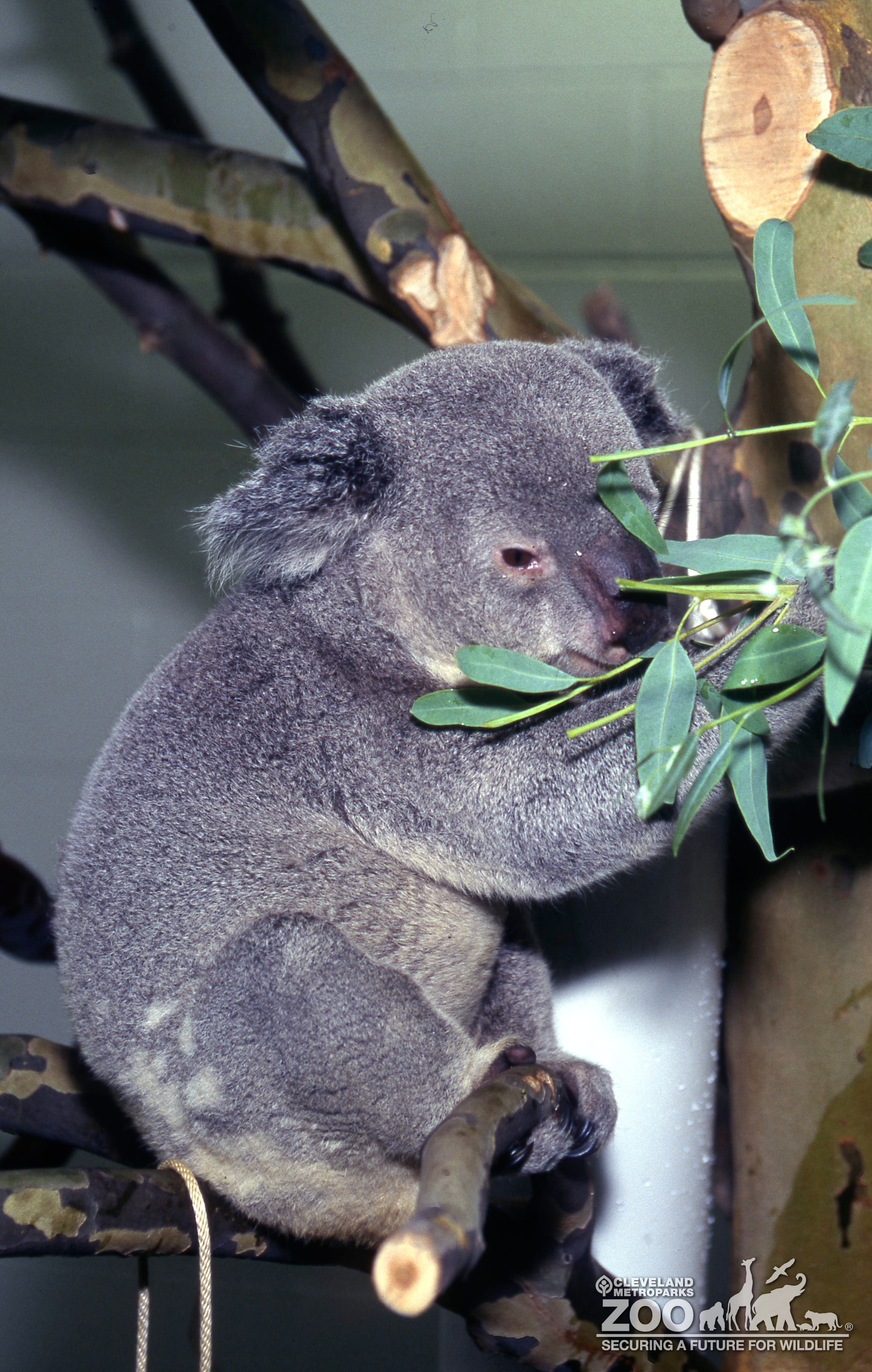 Koala eating eucalyptus leaves while sitting on a branch. Animal is facing to the right. This is in Gumleaf Hideout.