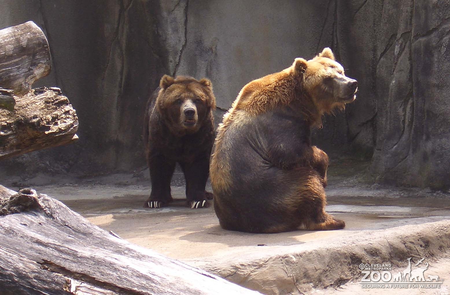This photo features two large adult Grizzly Bears named Warren and Lester in their outdoor enclosure which has a large brown log in the foreground and has large rocky grey walls. The bear in the front is sitting with it's back to the camera, but is looking back at it over it's right shoulder. The bear in the back is standing on all fours looking directly at the camera. Both bears are covered in very dark brown fur on the their legs and body, but the color gets a bit lighter in tone around their neck and heads.