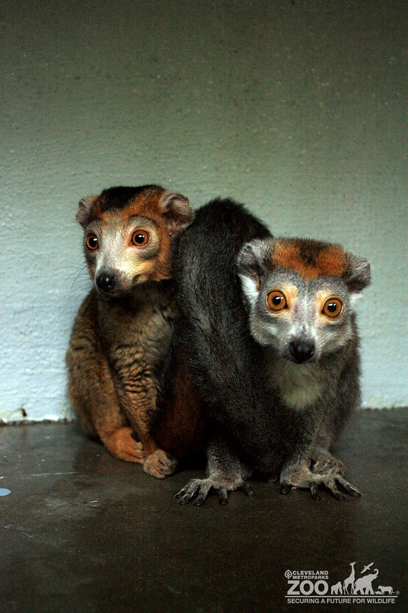 Pair of crowned lemurs huddled to gather looking forward. Both have large brown eyes but there body fur color is different. One is more brownish red and they other is black.