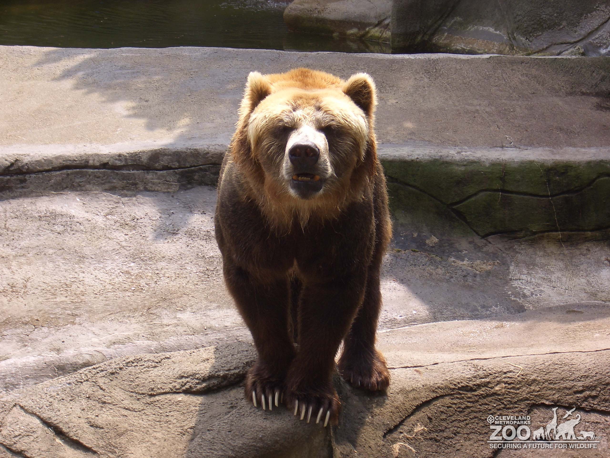 This Grizzly Bear is standing on the grey rocky ground of it's outdoor enclosure looking directly at the camera. The bear is standing in the sun with it's mouth open slightly exposing it's teeth, it almost looks as if the bear is smiling. The bear is covered in reddish brown fur around it's head with darker fur on it's legs and body, it has a big black nose, and nails that are about 5 inches long.
