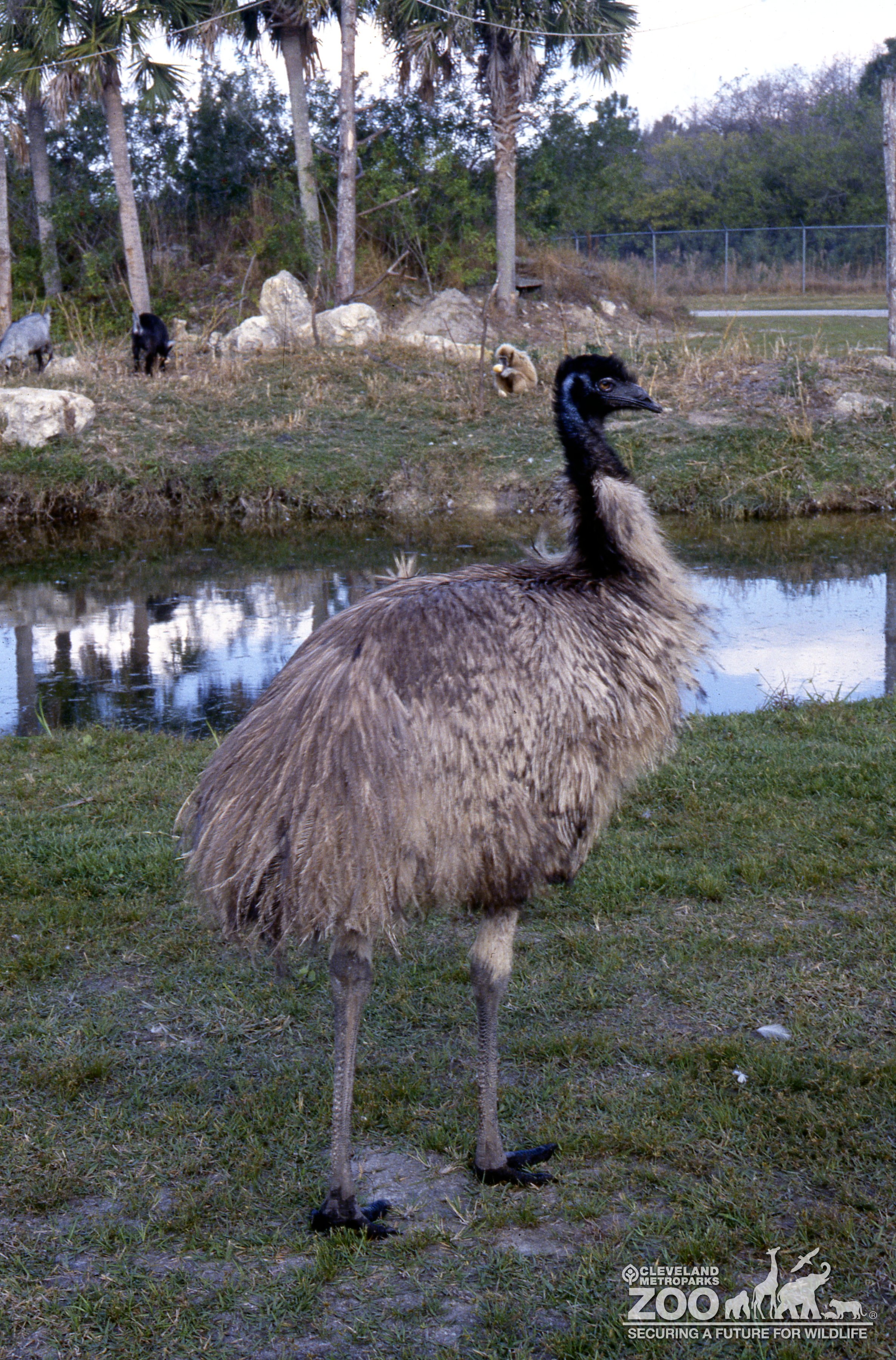View from rear of emu in habitat with head facing right. A small pond is in front of the emu. The emu has feathers in shades of brown while the toes, neck, and head are black.