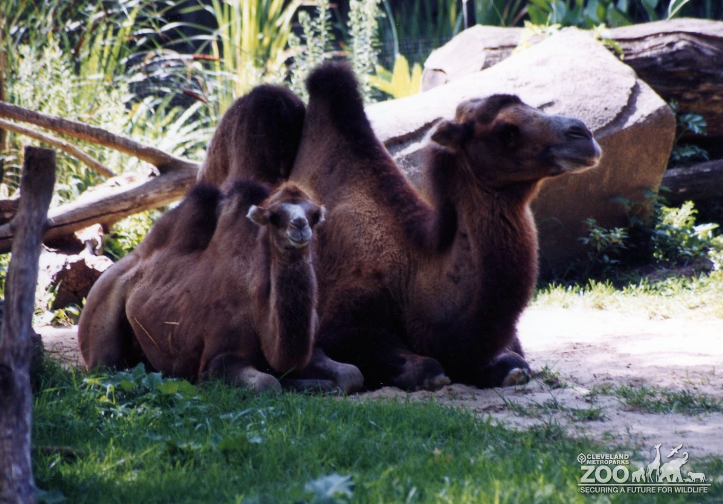 Two Camels, an adult and a baby, lying together in the shade of their outdoor enclosure. They are both covered in dark brown fur with two large humps on their back. The baby is looking towards the camera while the adult looks off in the other direction.