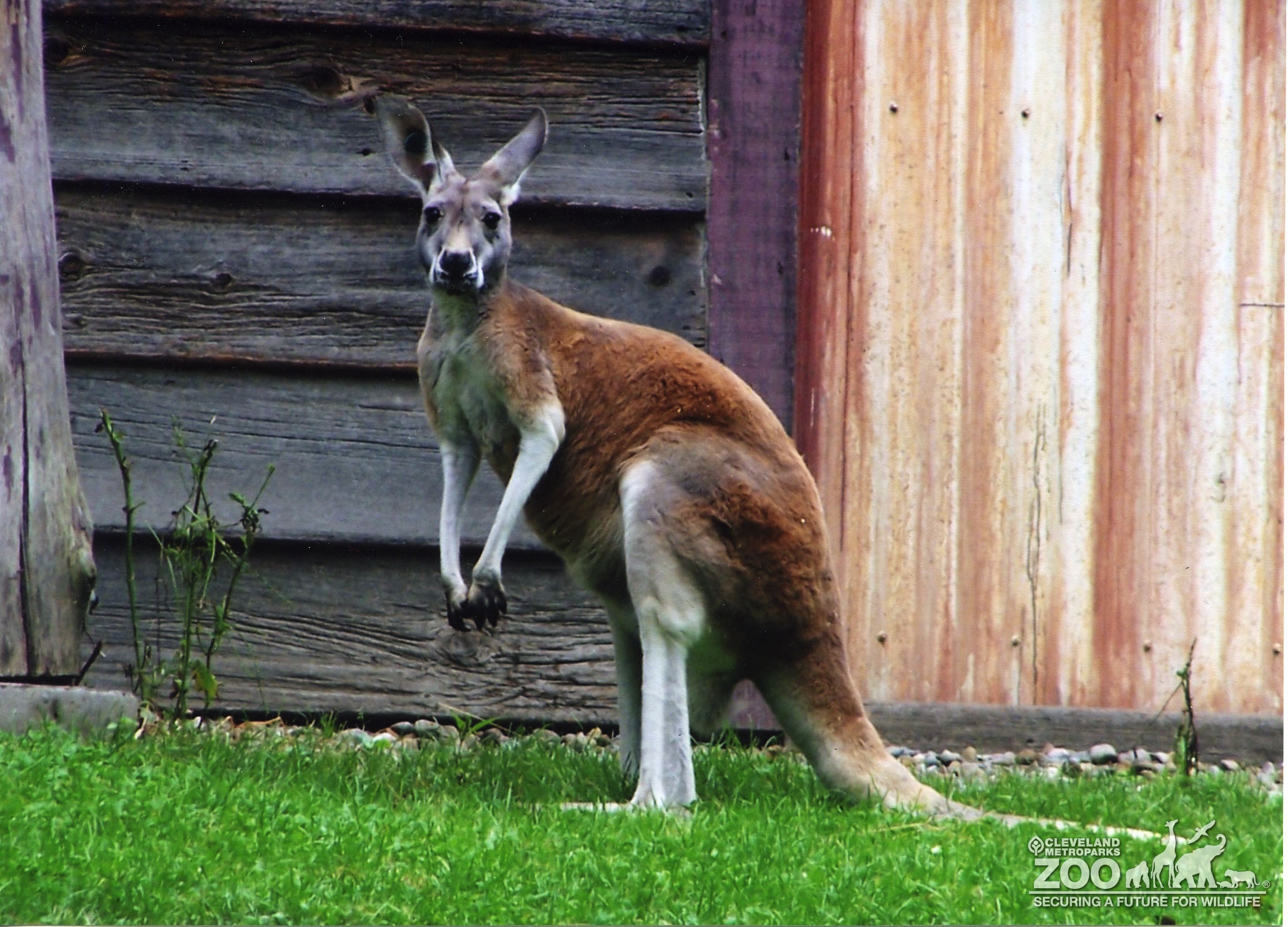 Red Kangaroo in shades of red brown, gray, and white stands in habitat with in front of wooden building, body facing left and head facing the camera.
