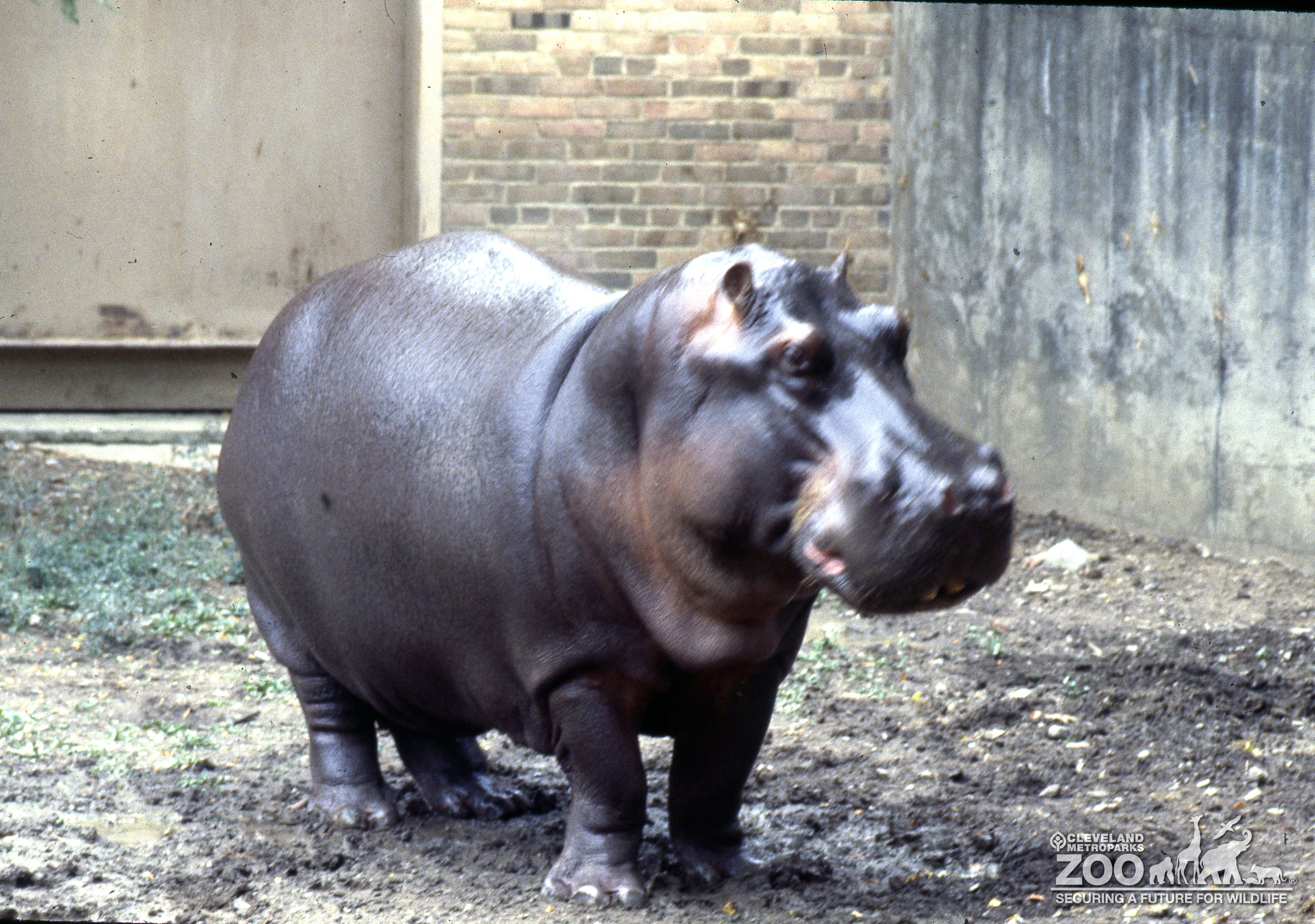 Nile hippo, Blackie in outdoor exhibit behind the old pachyderm building. View of massive body. Colors in image are faded to a gray tones overall. Building brick wall is in the background.