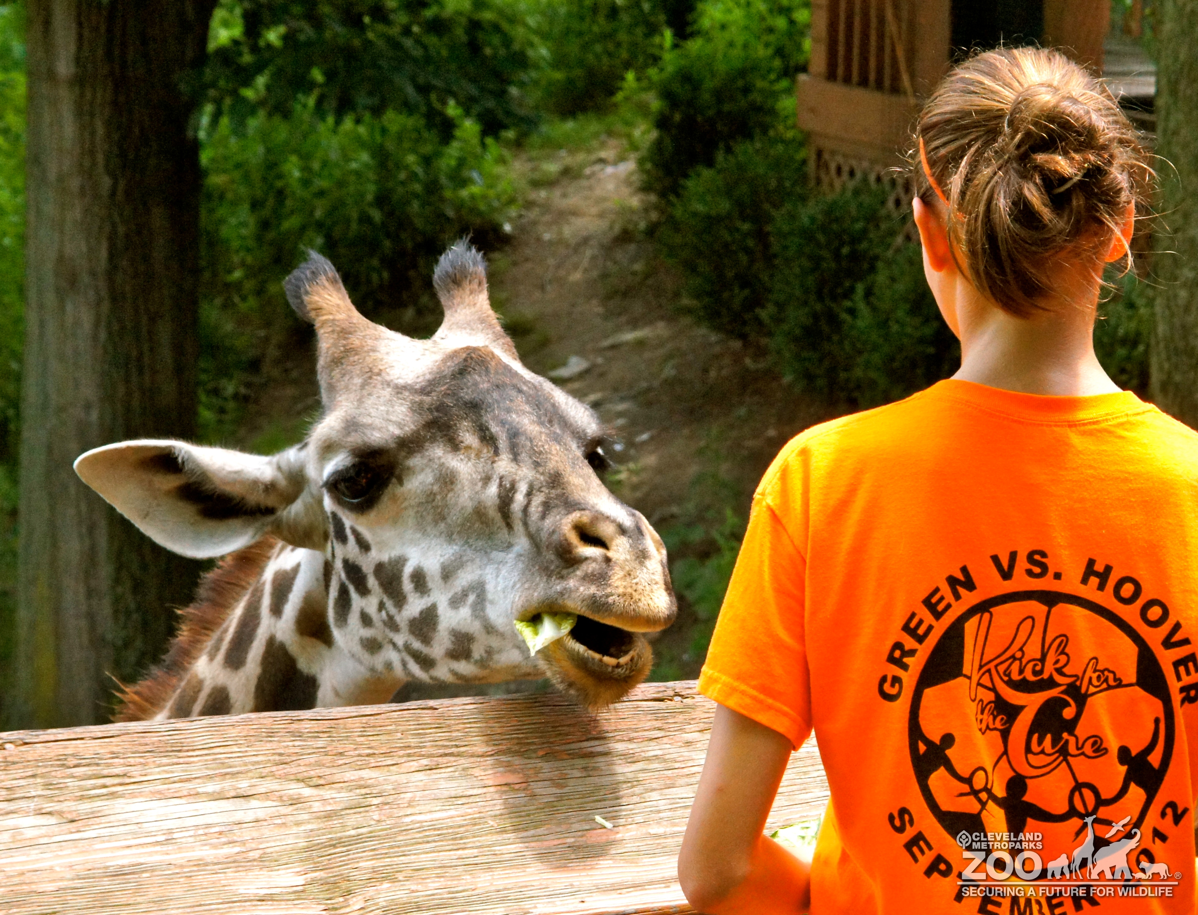 An adult giraffe is chewing a romaine leaf that a young female guest has feed it. The girl's back is to the camera and the giraffe's large head in leaning over the wooden railing. This feeding session was on the old giraffe deck.