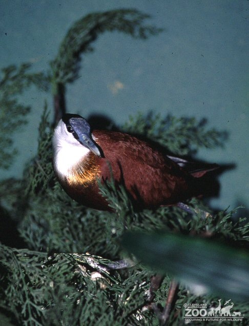 Wattled jacana is sitting on an evergreen branch. The bird's bird is slightly twisted facing right. Its has a black capped head, white throat and reddish brown body.
