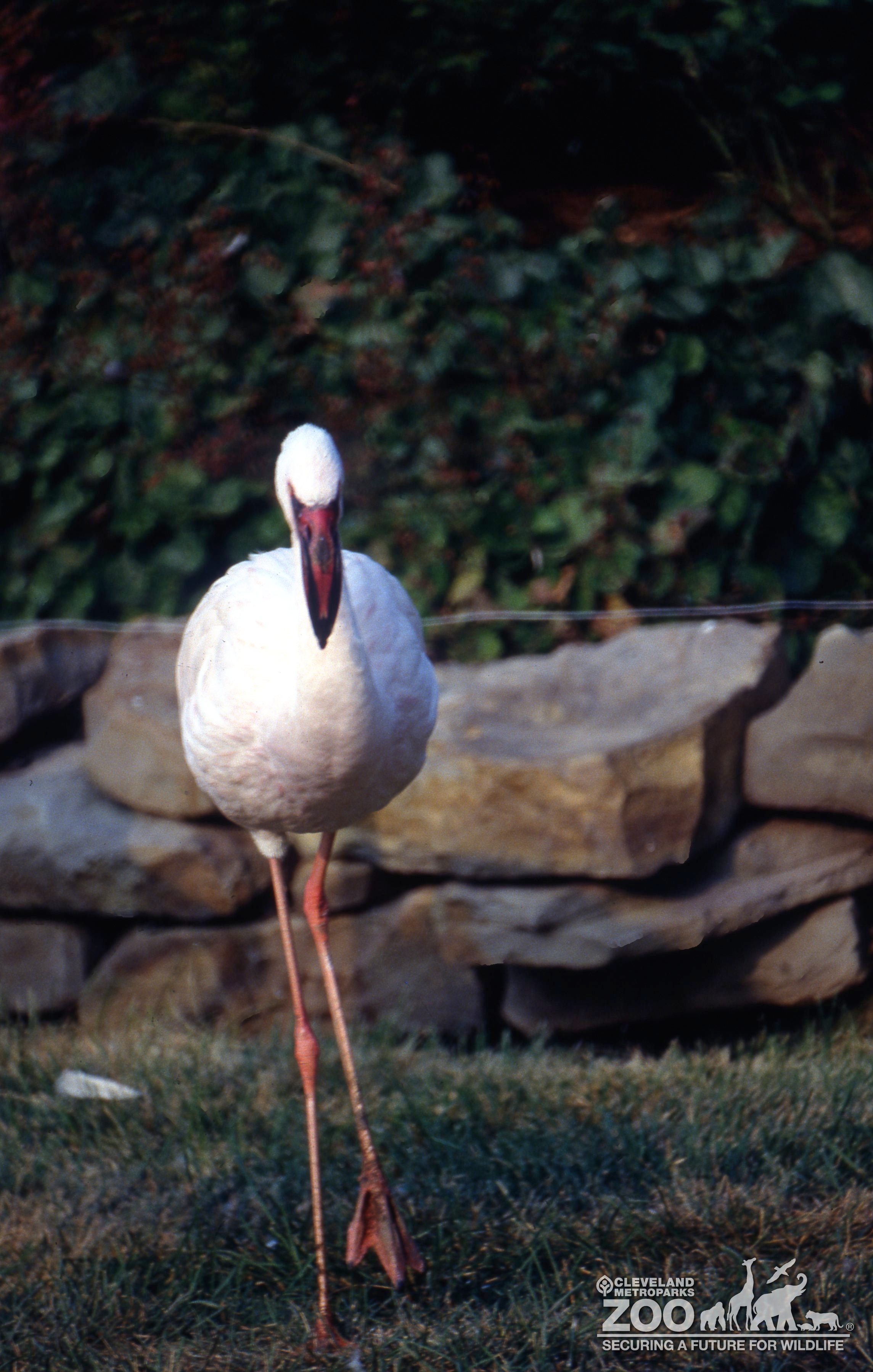 Lesser flamingo in shades of white facing forward in habitat with left pink and orange leg lifted forward in walking motion. Beak pointing down has shades of orange and black.