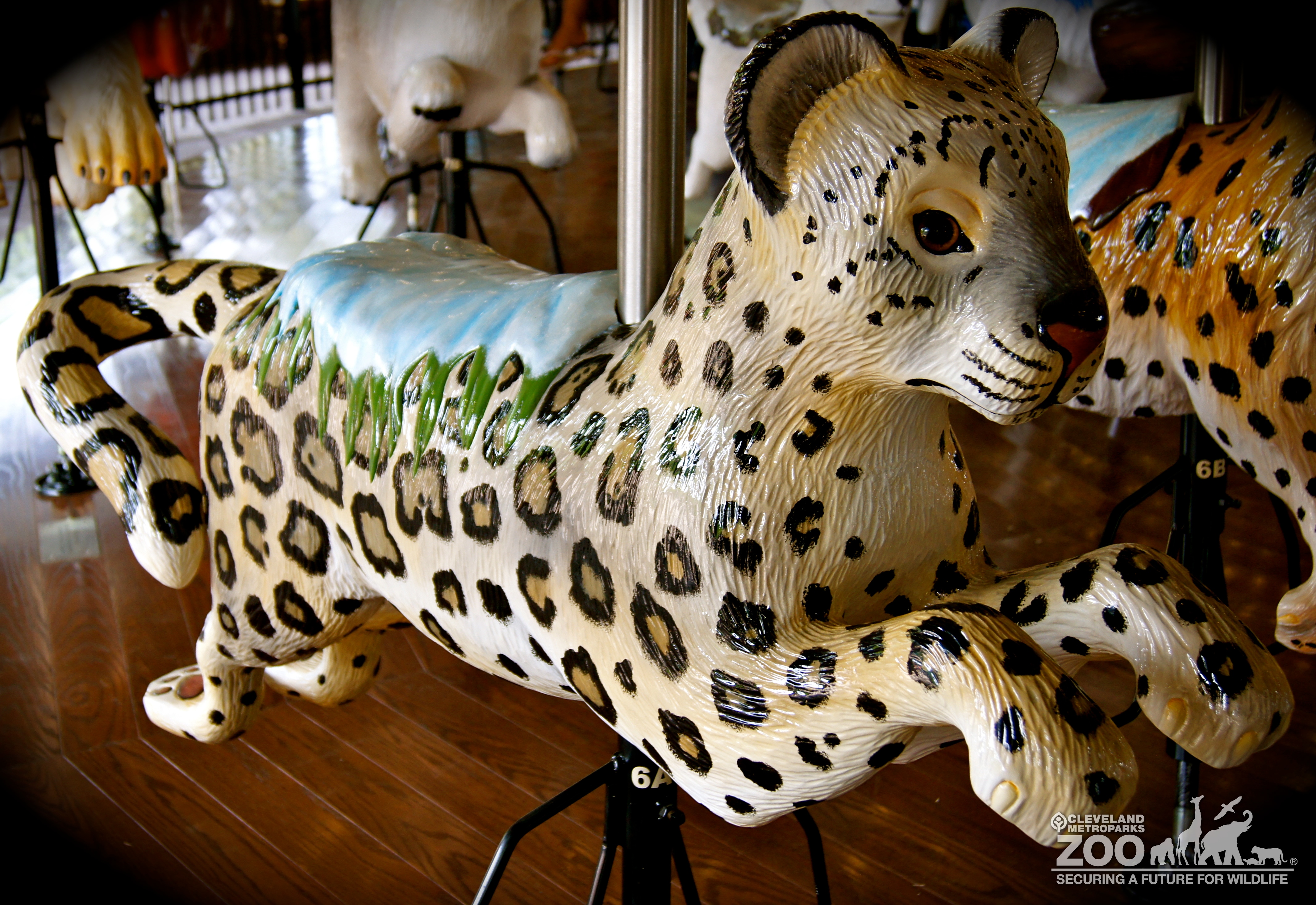 Snow leopard carved wooden carousel sculpture. Painted and able to be ridden by a guest. Located in Circle of Wildlife area.