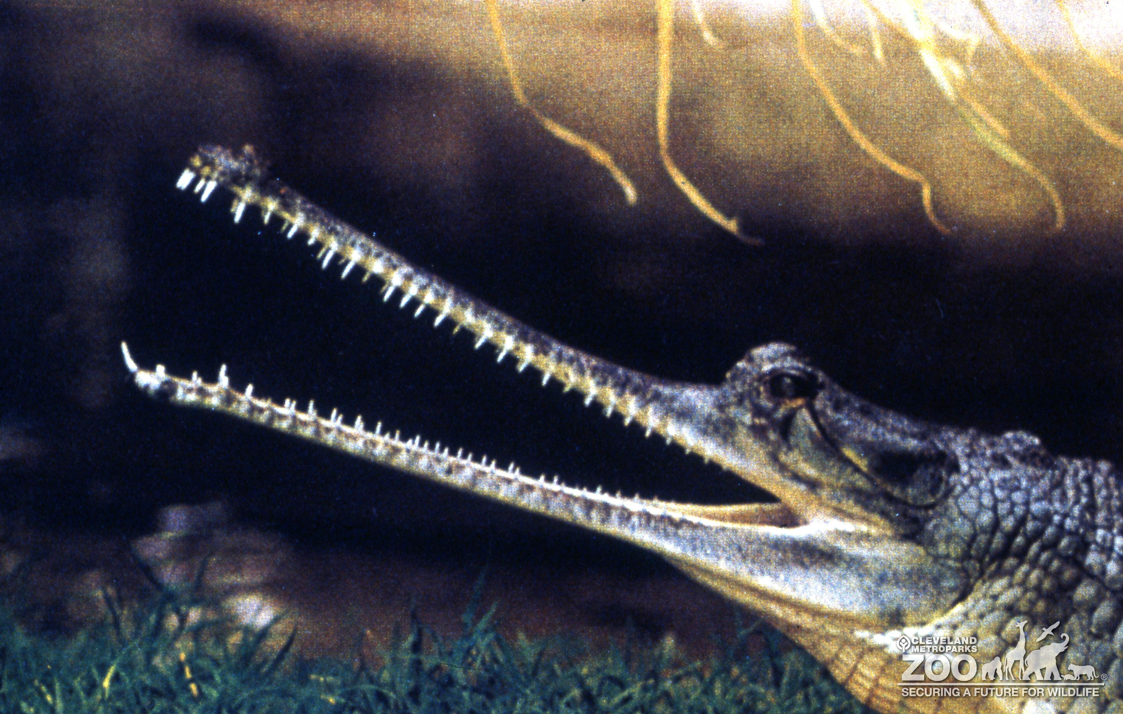 This gharial has it mouth open and showing its sharp teeth that line the top and bottom jaws. A gharial looks similar to a crocodile but with a much narrower snout. This gharial is outside and you can see grass and murky water. The eyes of the gharial sit on top of it large flat head. The skin is dark on top and lighter underneath.