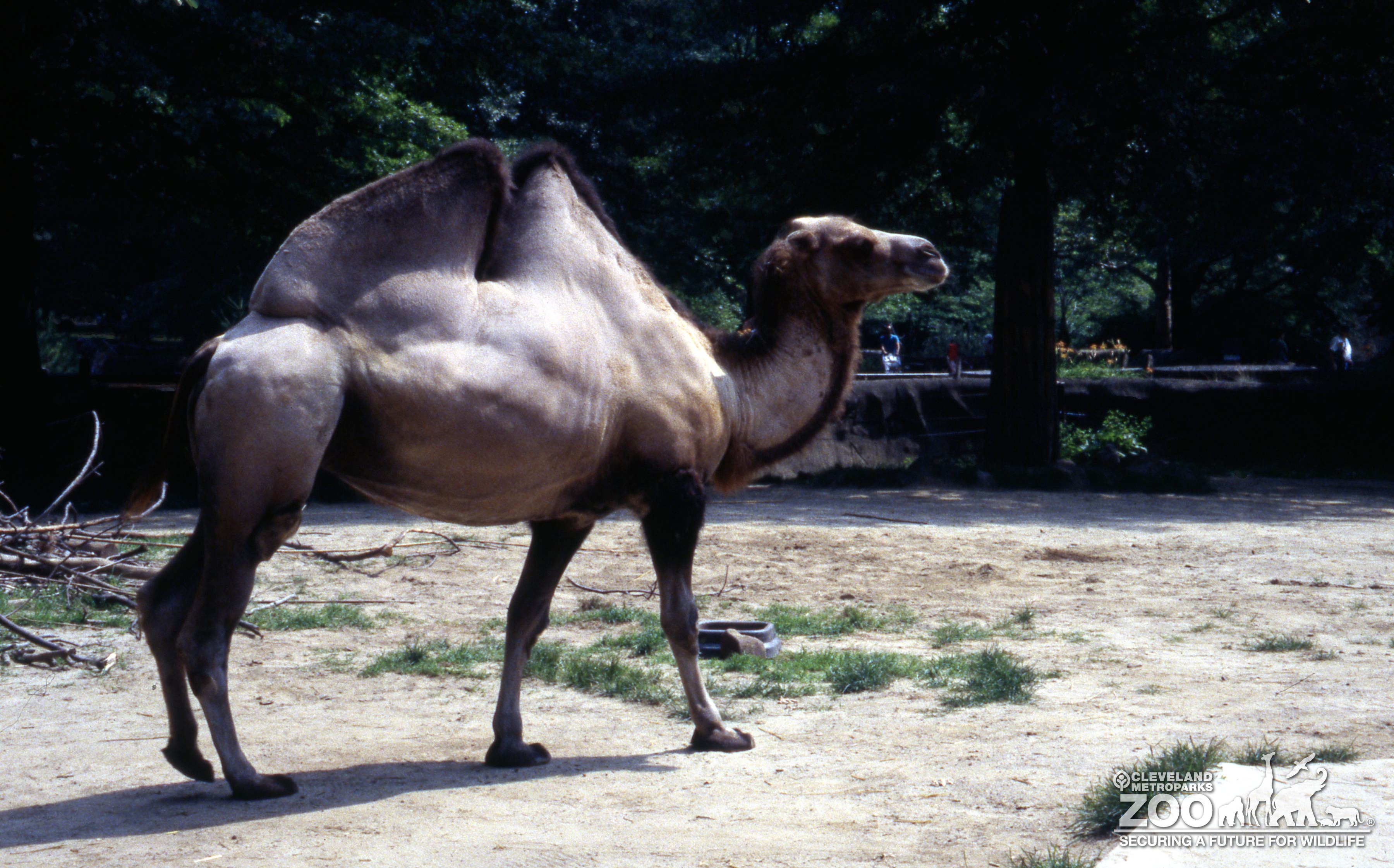 A photo of the right side of a Camel walking through in its outdoor enclosure. It is covered in light brown fur with two large humps on its back. Down the front of its neck, the camel has long strip of dark brown fur.