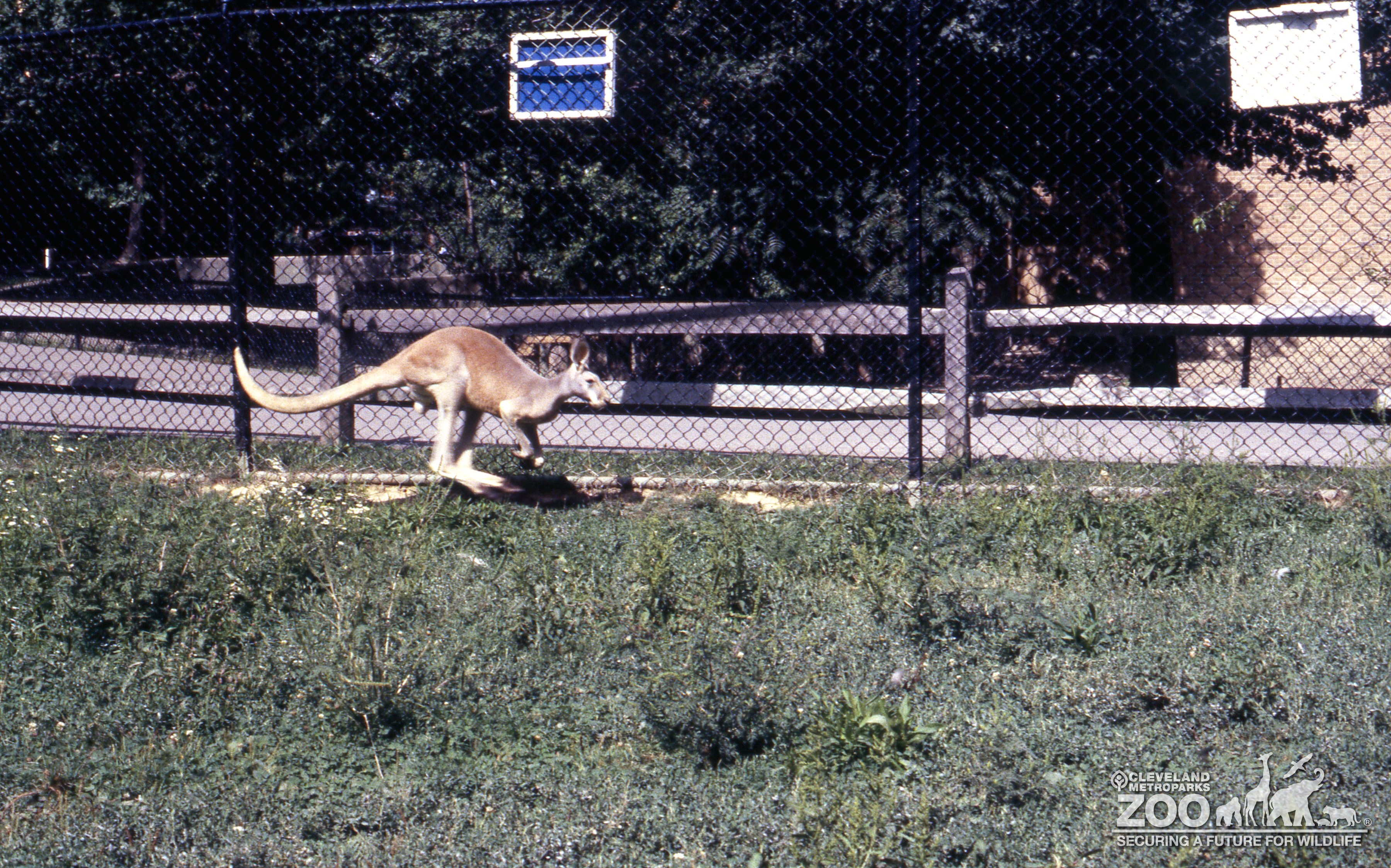 Red kangaroo hopping in an old exhibit surrounded by chain link fencing. Animal is hopping to the right. Grassy field is in the foreground.