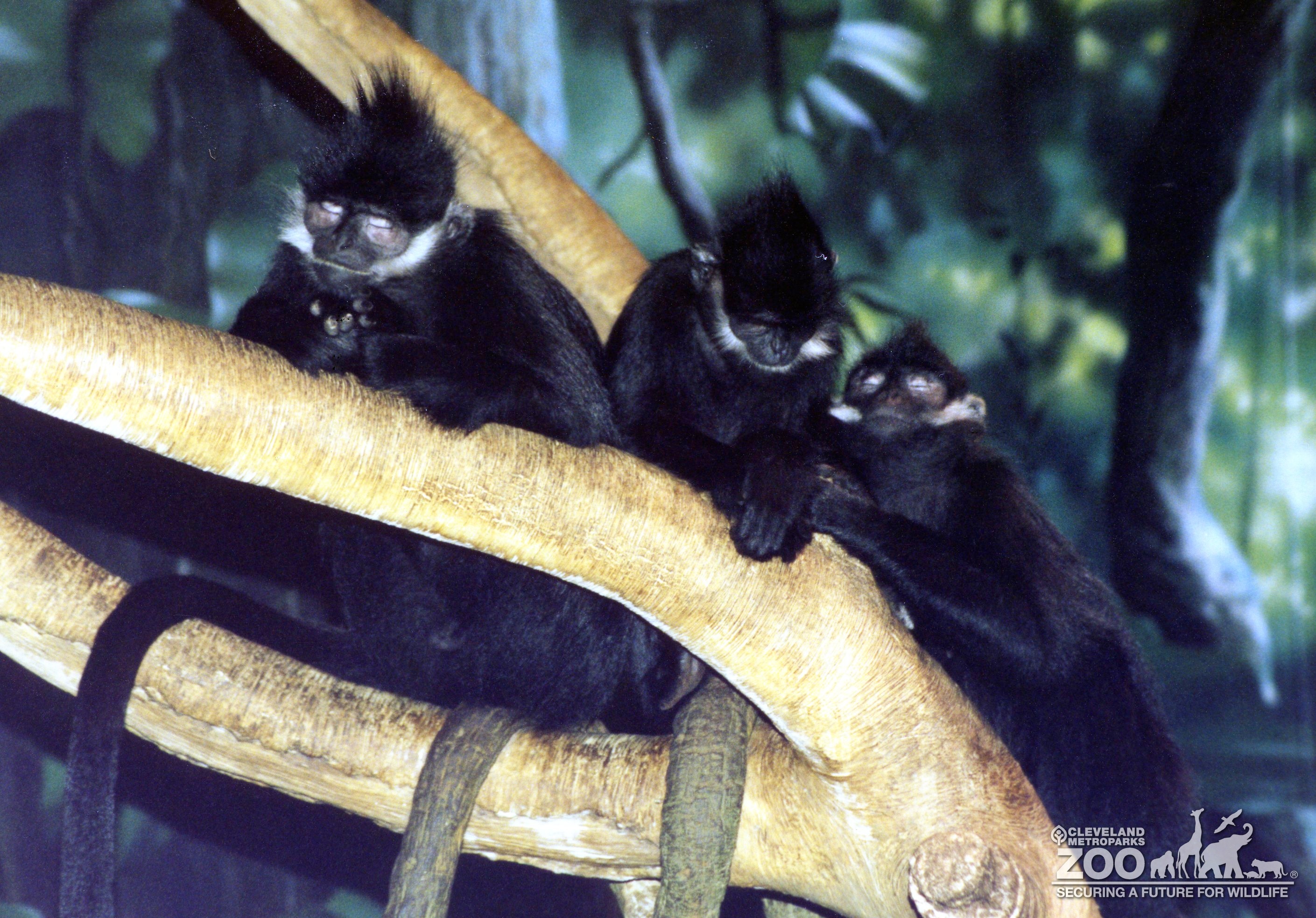Three Francois langurs lounging on a man-made tree branch. They are in The RainForest exhibit. Jungle mural provides the background.