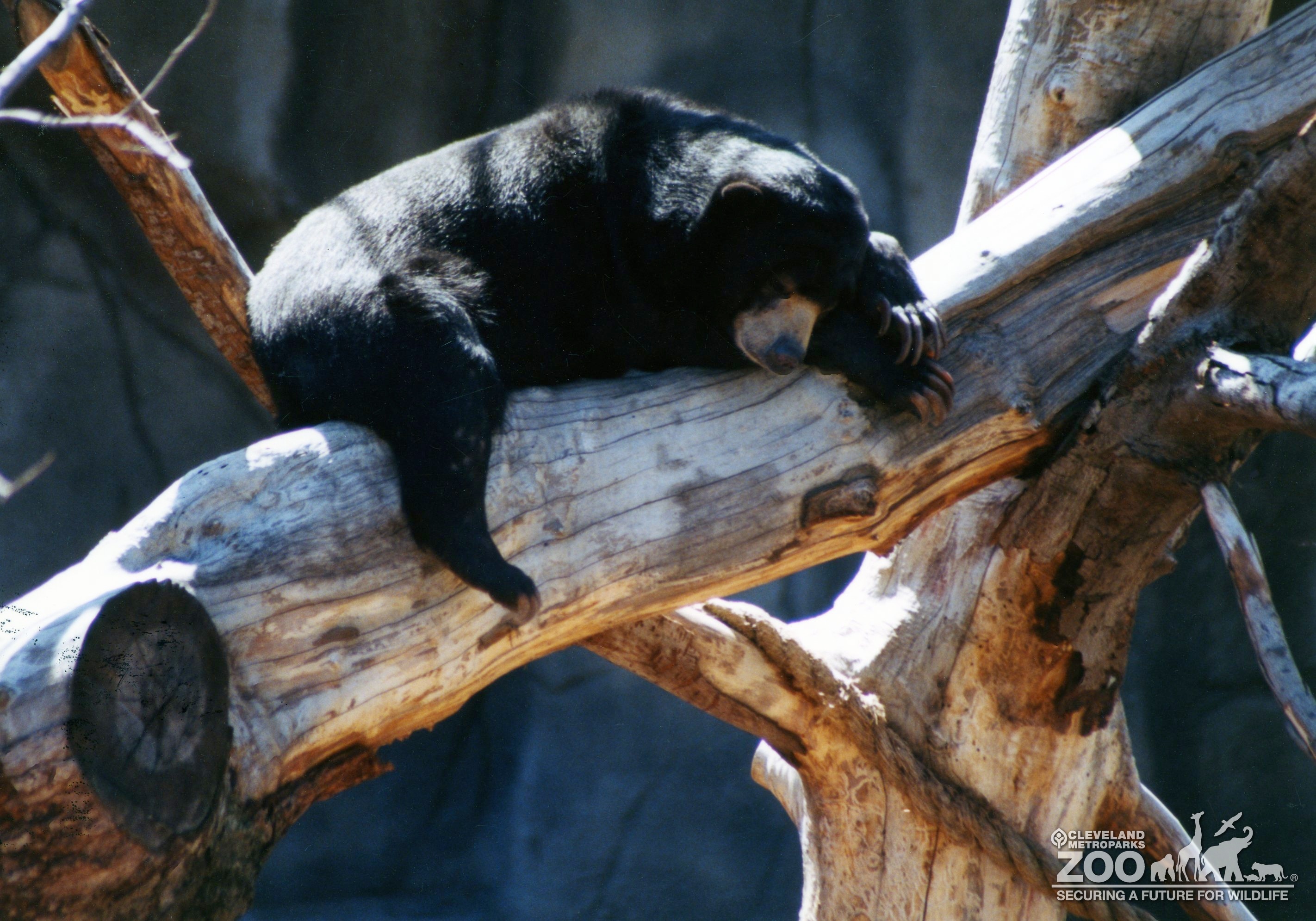 The Andean (Spectacled) Bear in this photo is sleeping on a large tree trunk which is laying diagonally against another large tree in it's outdoor enclosure. The bear is facing the camera with it's head resting on it's front paws and rear right leg hanging off side of the tree trunk. The bear is covered in black fur with brown fur around it's muzzle as well as flecks around it's eyes giving the appearance that it is wearing spectacles.