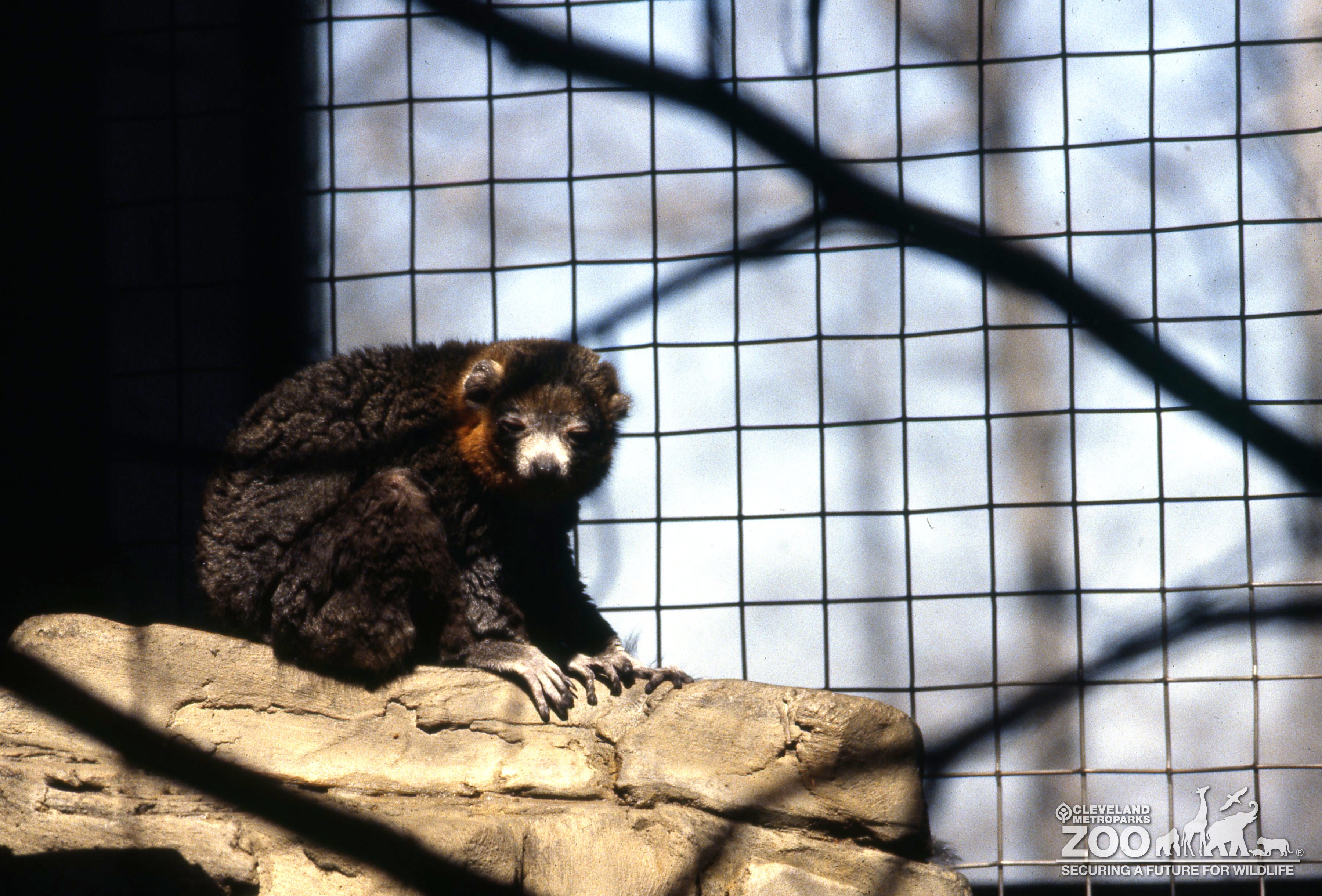Mongoose lemur napping on a rock in its habitat. Animals has thick brownish black fur on it body. It has short ears and snout. Nose is black with tan fur around it.