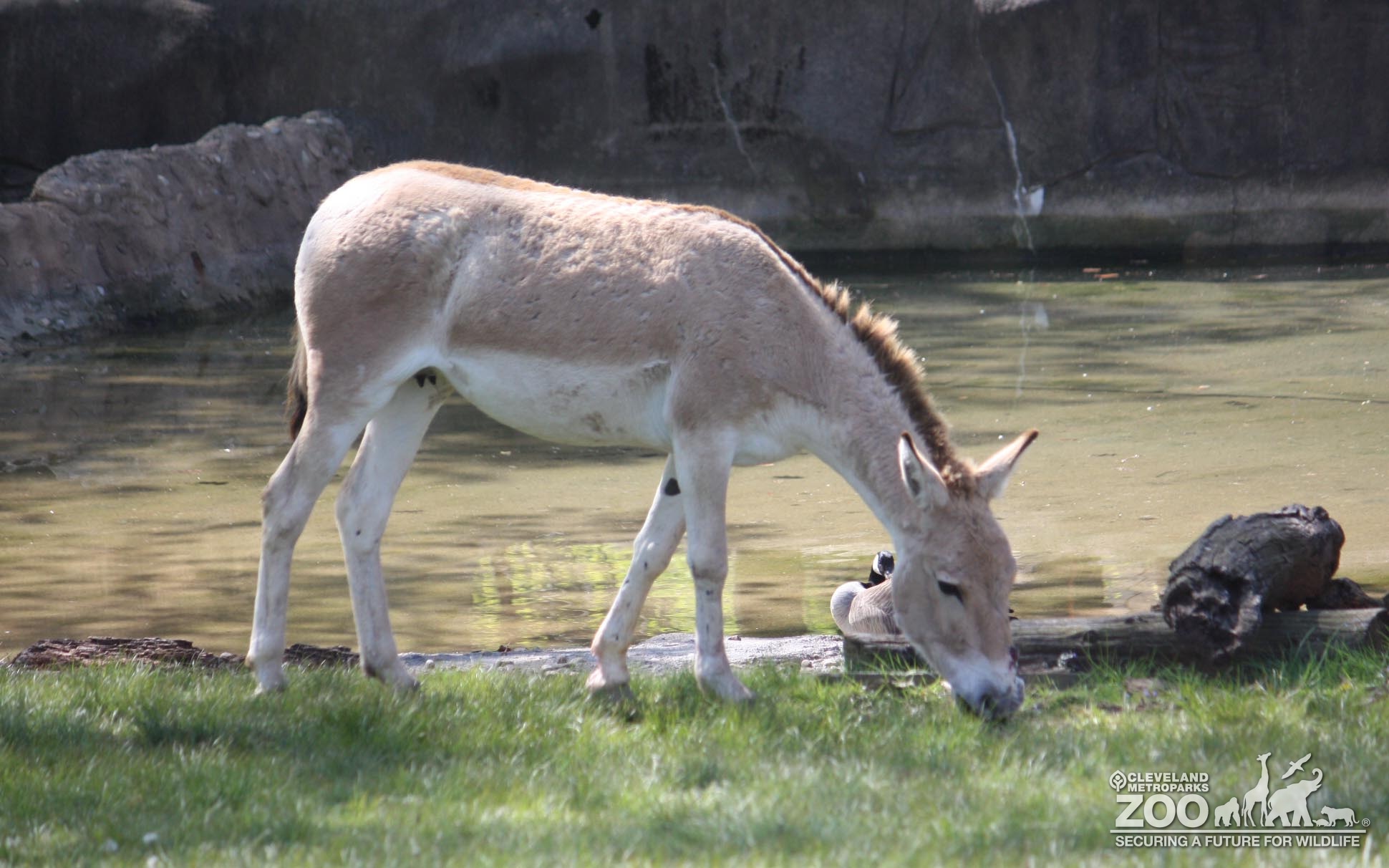 Persian Onager viewed from the side. Animal is part of the equine family. Its fur is tan and ears are large like a donkeys. Animal is outside by a small pond.