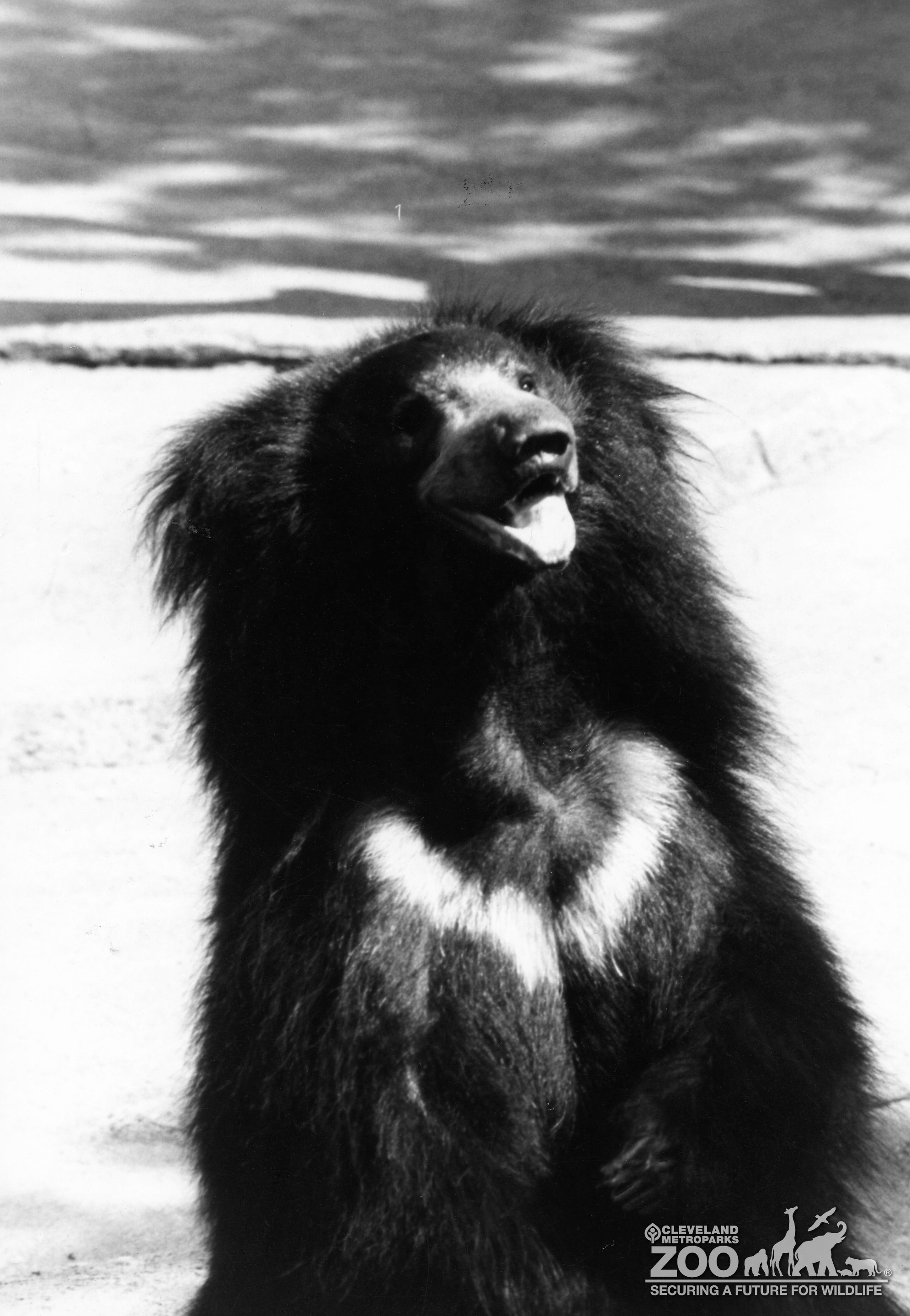 This is a black and white photo of a Sloth Bear sitting up on it hind legs looking up at the camera. It is sitting up with its mouth open and tongue hanging out. The bear is covered in long black fur with light brown fur on its muzzle and a single curved stripe across its chest.