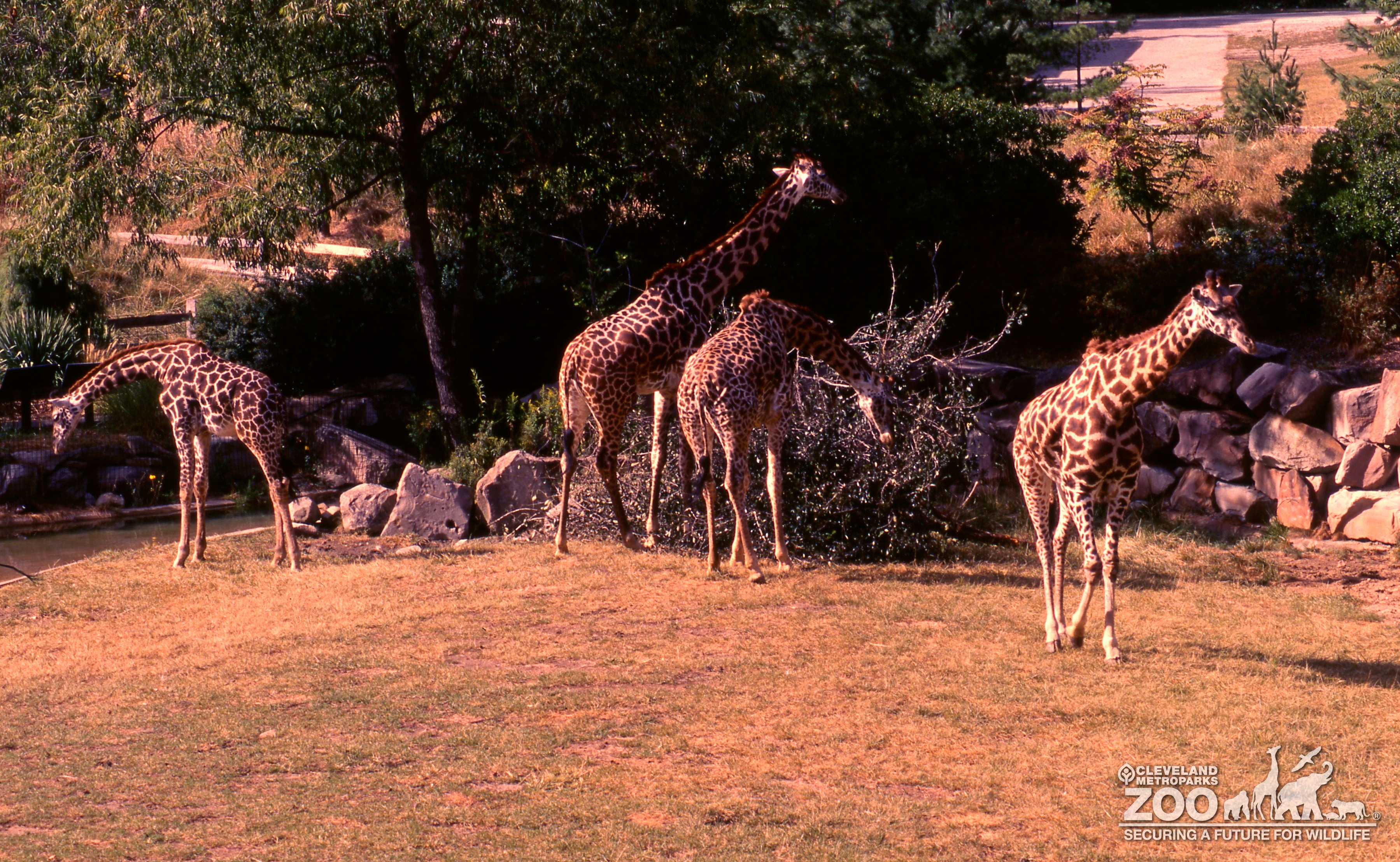 Four Masai giraffe eating browse in African savanna yard. Grass is brown, in the yard, from the summer heat. Two giraffe appear smaller and younger. Low rock wall and green trees in background.