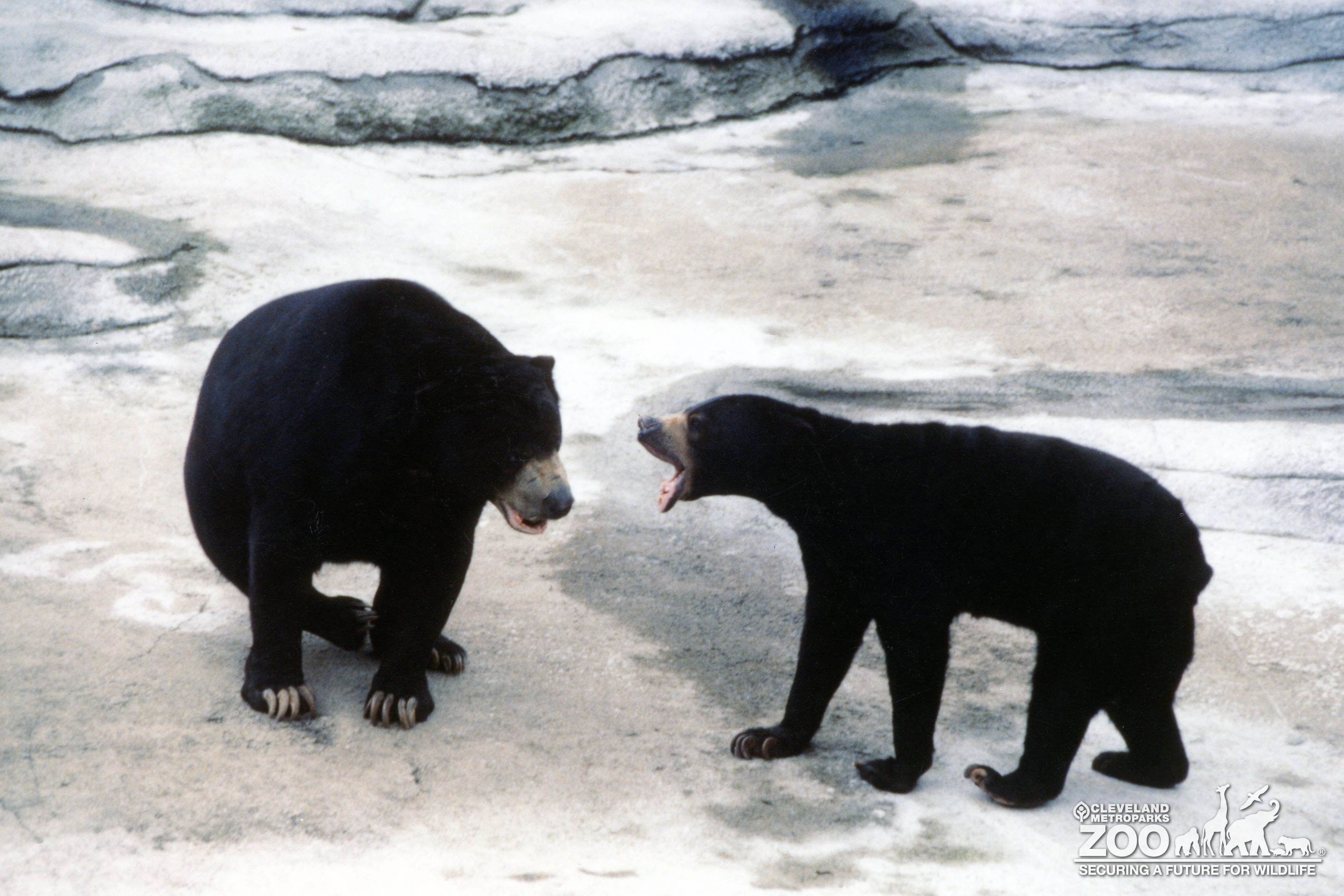 These Malayan Sun Bears are standing in their outdoor enclosure talking to each other. The bear on the right is facing the bear on the left with it's mouth wide open, while the bear on the left is facing forward with it's head turned slightly towards the other bear. Both bears are covered in short black fur with light brown fur around their muzzles.