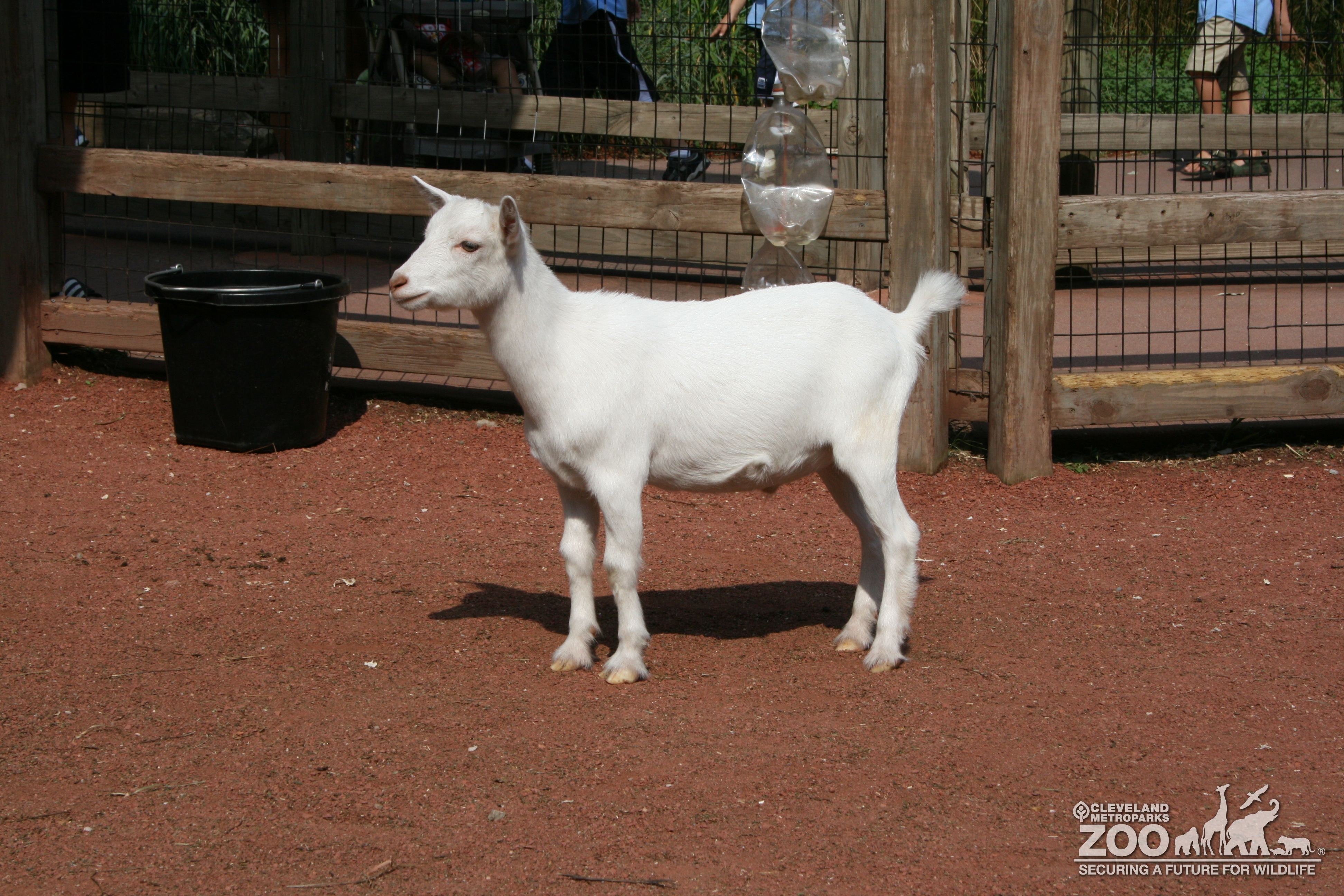 White dwarf goat standing in habitat facing left.
