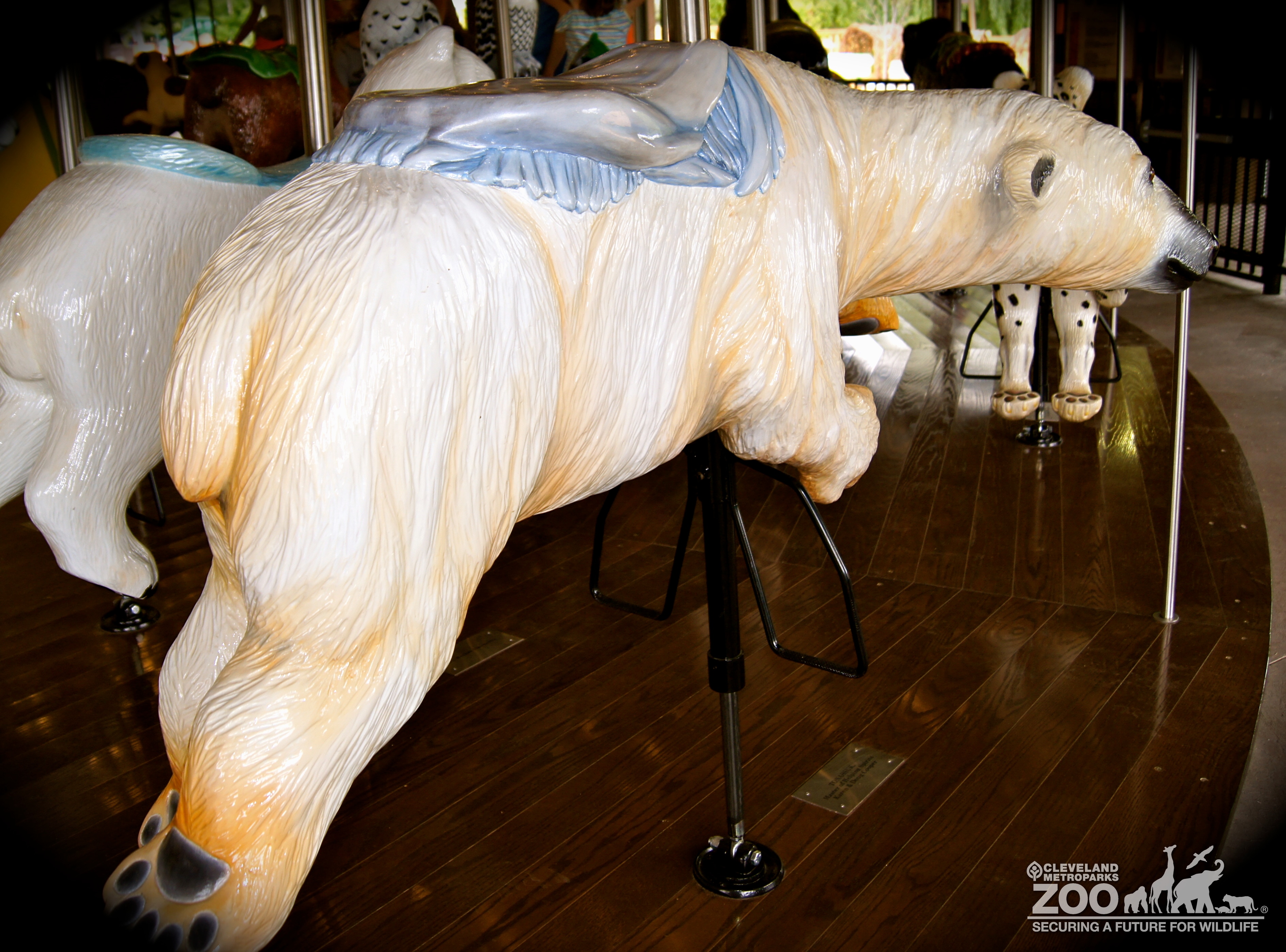 This is a photo of the rear of the Polar Bear shaped seat on the Zoo's Circle of Wildlife Carousel. It is shaped to look as if it is running with it's front & back paws in the air and it has a small light blue saddle on its back for a rider to sit on. The bear is covered in white fur with patches of yellowish brown fur on it's underbelly and on the back of its legs.