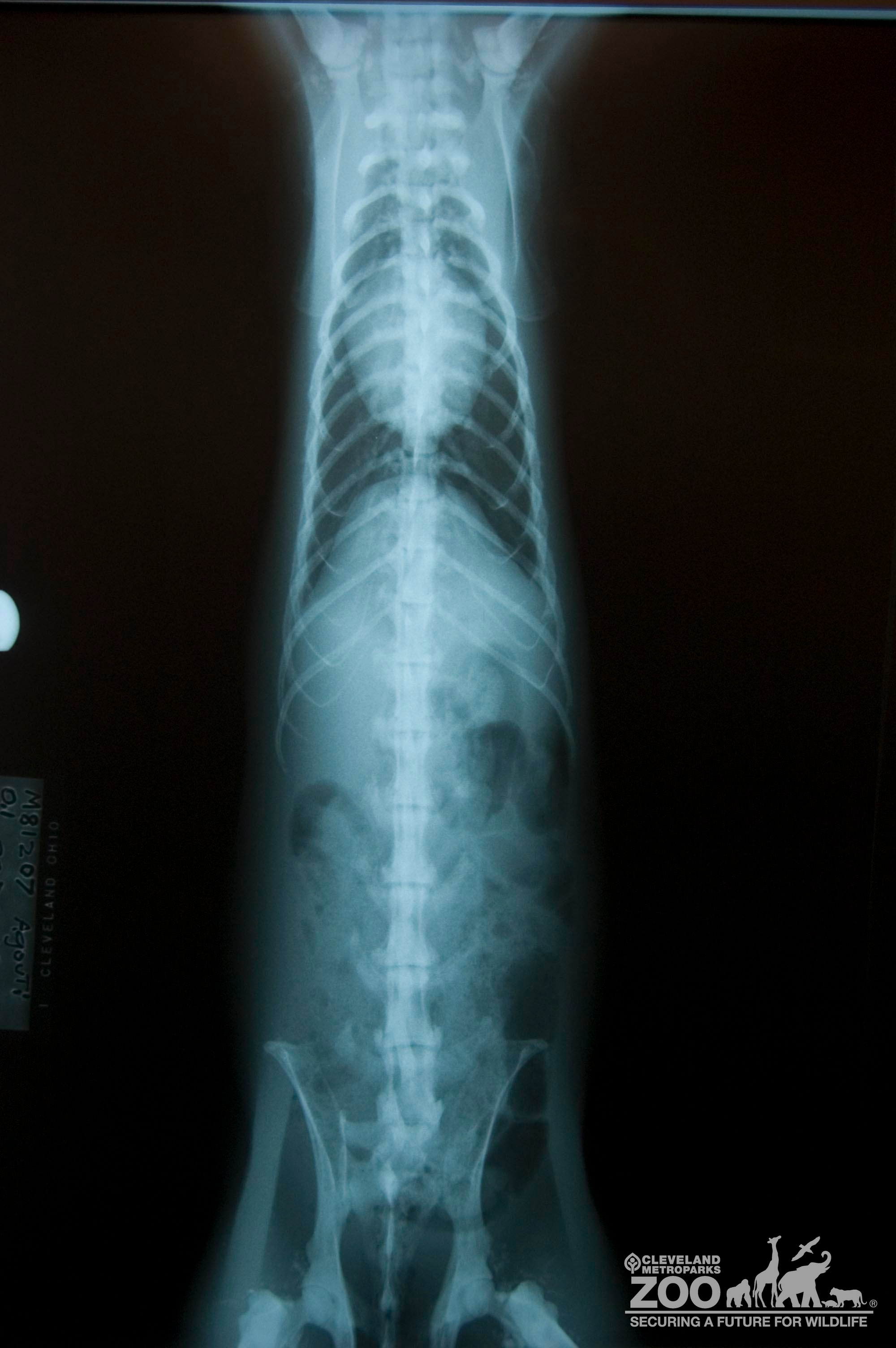 The Agouti in this photo has been x-rayed from the underside of the animal. The parts of Agouti's skeleton that are visible include it's pelvis, spine, ribcage, shoulder blades and some internal organs. The bones and organs of the Agouti are white in color while the background of the photo is completely black.