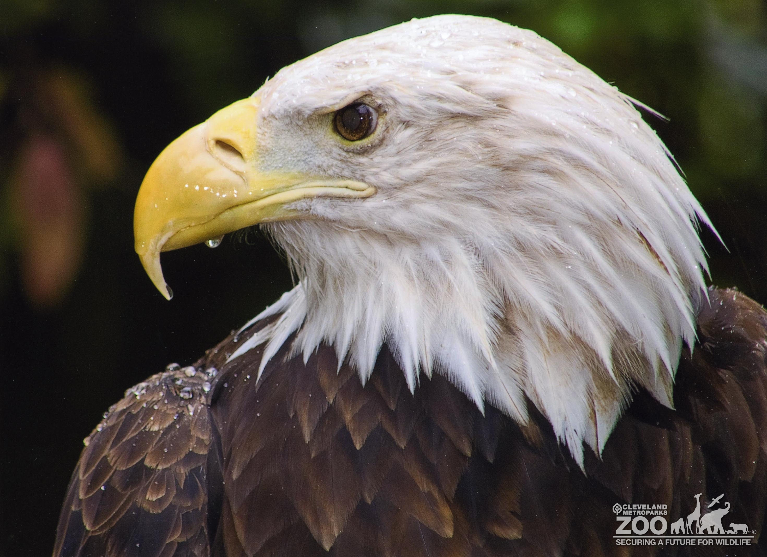 Amazing close up view of bald eagle with drops of water coming off it's yellow beak.