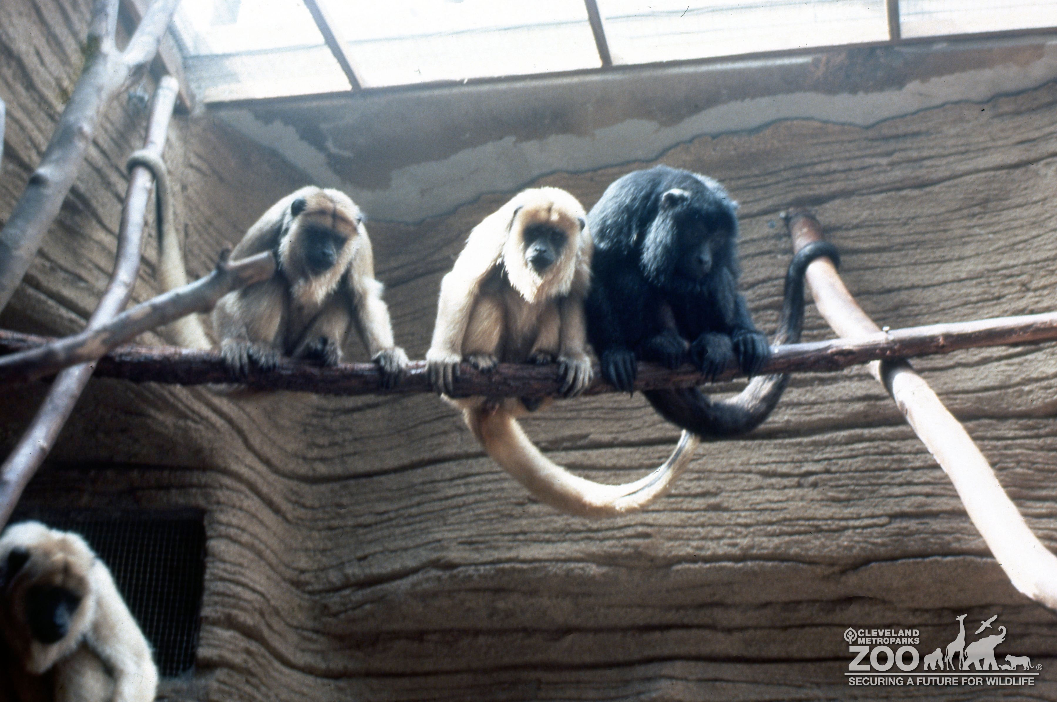 Black howler monkeys sitting trio on a branch. The male is black and larger the other two have golden tan fur. Another light color primate is sitting below the trio off to your left.