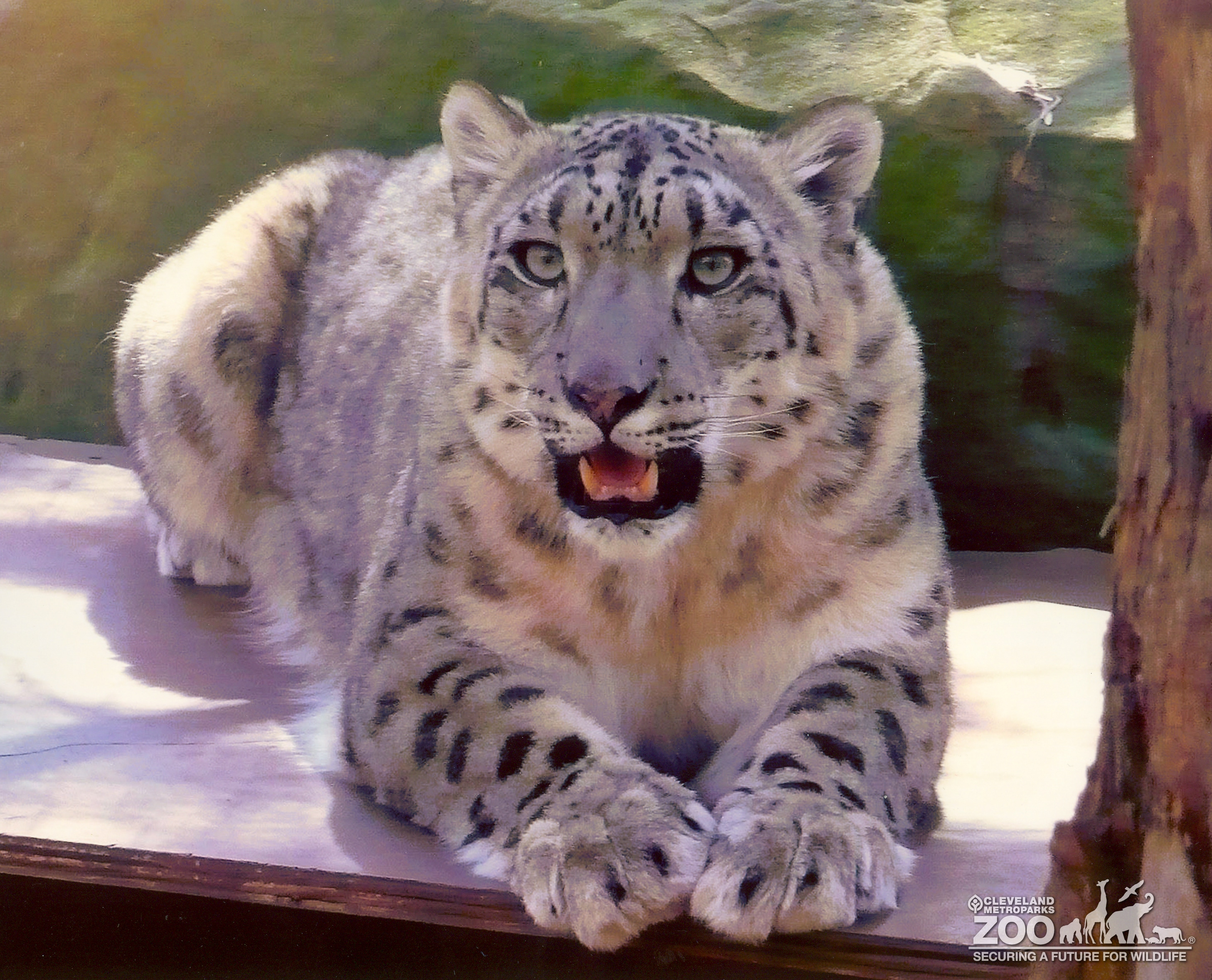 Snow leopard with paws out front while it is lying outside. Cat has mouth open showing is sharp teeth.