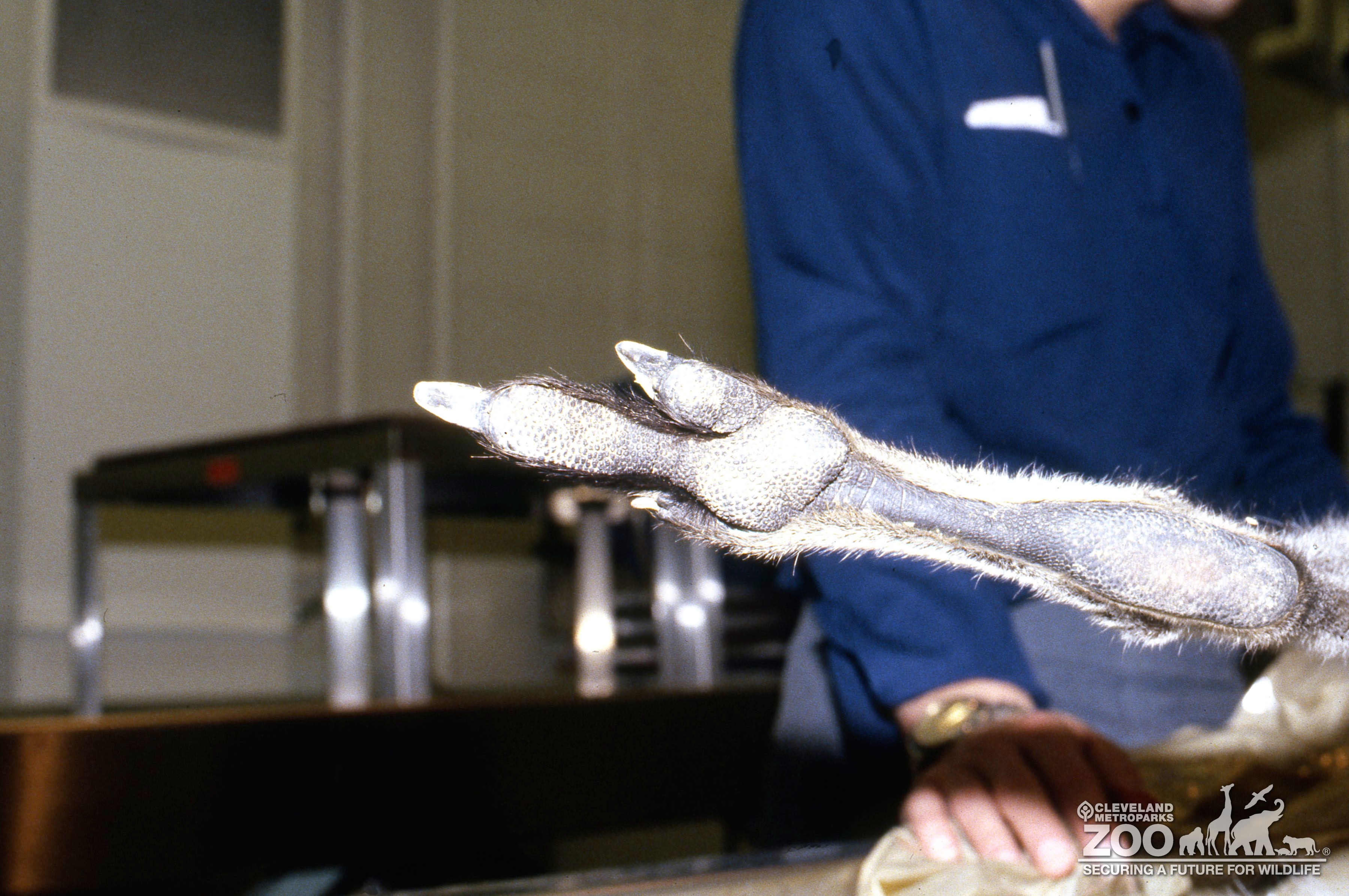 Red kangaroo getting an examination. Staff is looking at its foot. All you see is the bottom of its foot.