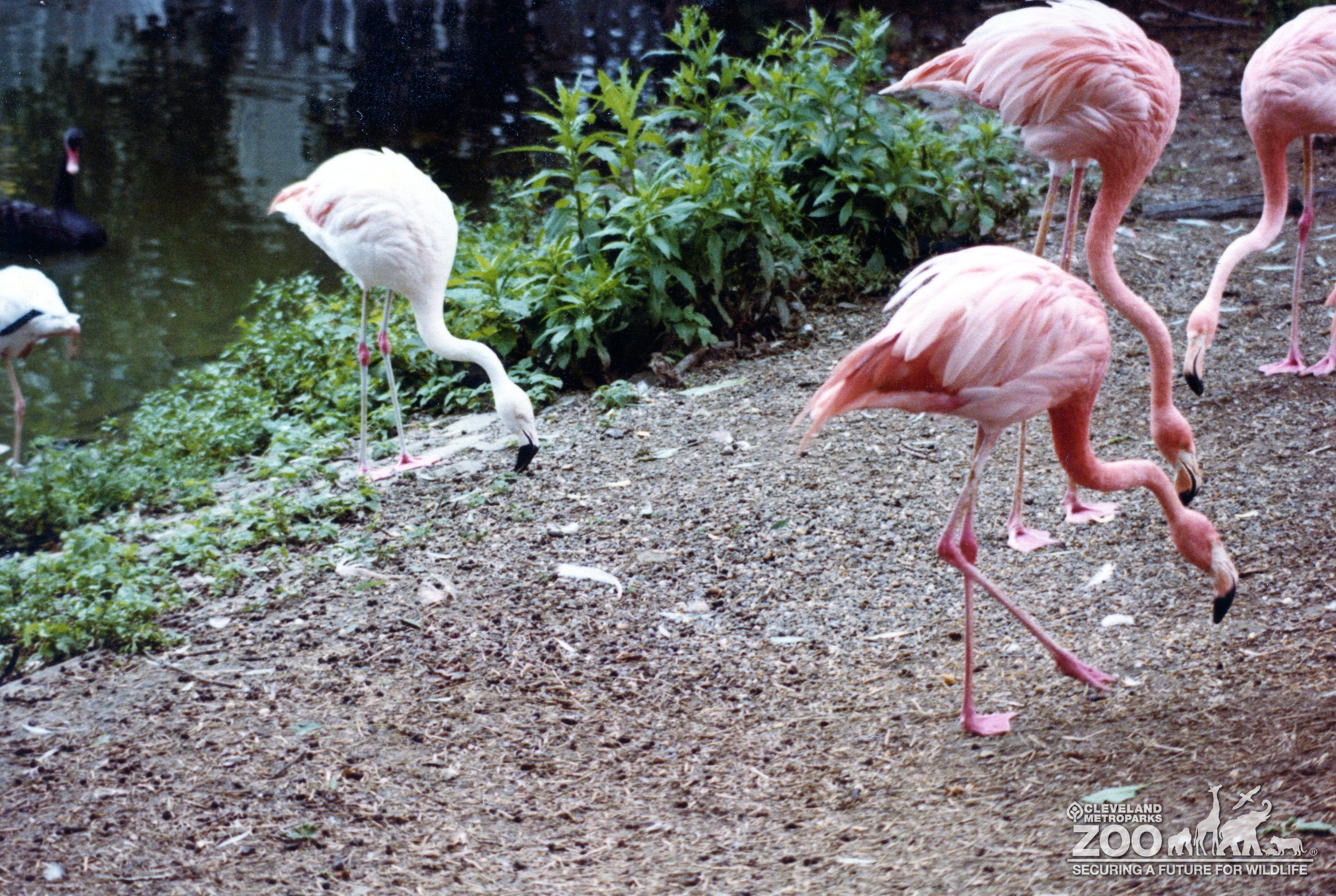 Four flamingos in view along brown ground with greenery leading toward pond in habitat. Three Chilean flamingos in shades of pink gathered near right side with one Chilean flamingo with more white coloring closer to the left side with greenery. All Chilean flamingos with heads lowered toward ground.