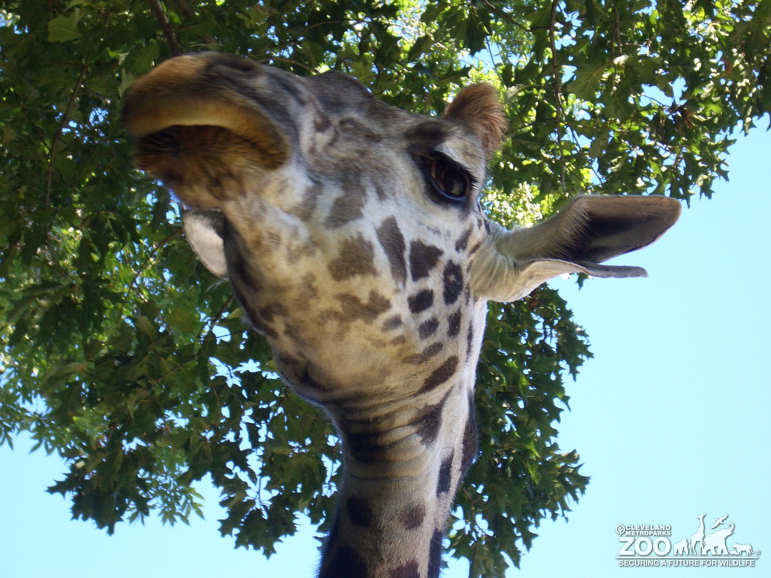 Close-up of a giraffe outside. The images is of a giraffe head taken from underneath its chin. The giraffe's head is surrounded by an over hanging leafy tree branch and light blue sky. The eye is looking down at you with hooded eyes.