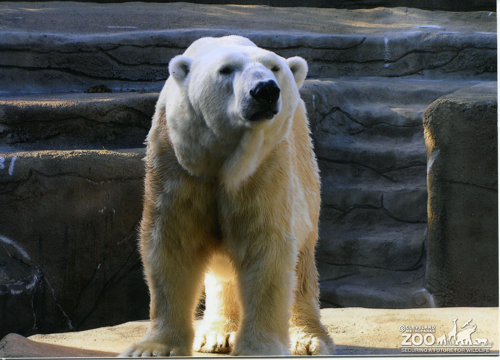 This Polar Bear is standing on a large brown slab in its outdoor enclosure. The bear is covered in white fur with some beige patches, has round ears, dark eyes, and black nose. The bear standing in the shade looking towards the camera and is surrounded by the grey rocky ledges of the outdoor enclosure.