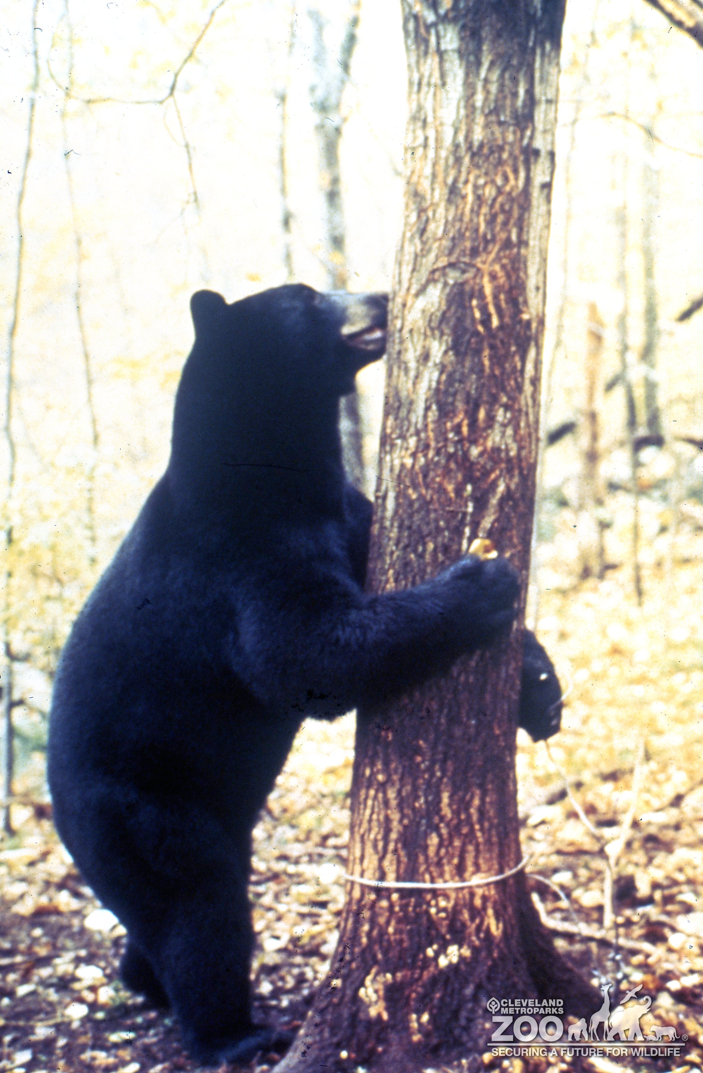 This North American Black Bear is standing on it's hind legs hugging a brown tree in the middle of the forest. It has it's front paws wrapped around the tree trunk and it's mouth pressed against the trunk as if it is trying to strip off a piece of bark. The bear is covered in short black fur all over it's body with a little bit of light brown fur around it's muzzle.