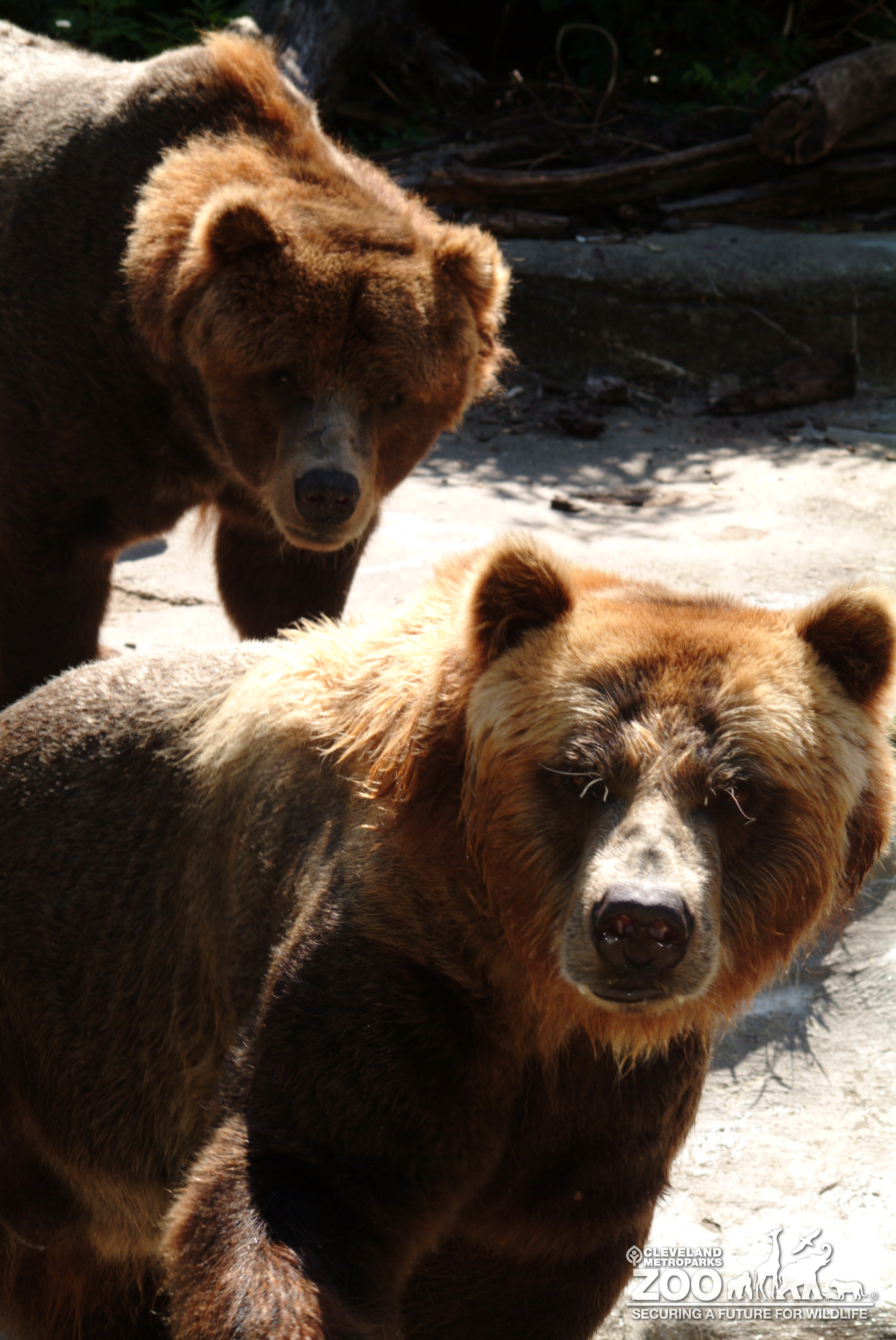 This photo features two Grizzly Bears next to each other in their outdoor enclosure. Both bears are looking directly at the camera giving a very clear view of their facial features. Both bears are covered in reddish brown fur with some patches of blond fur. They have large black noses and round ears.