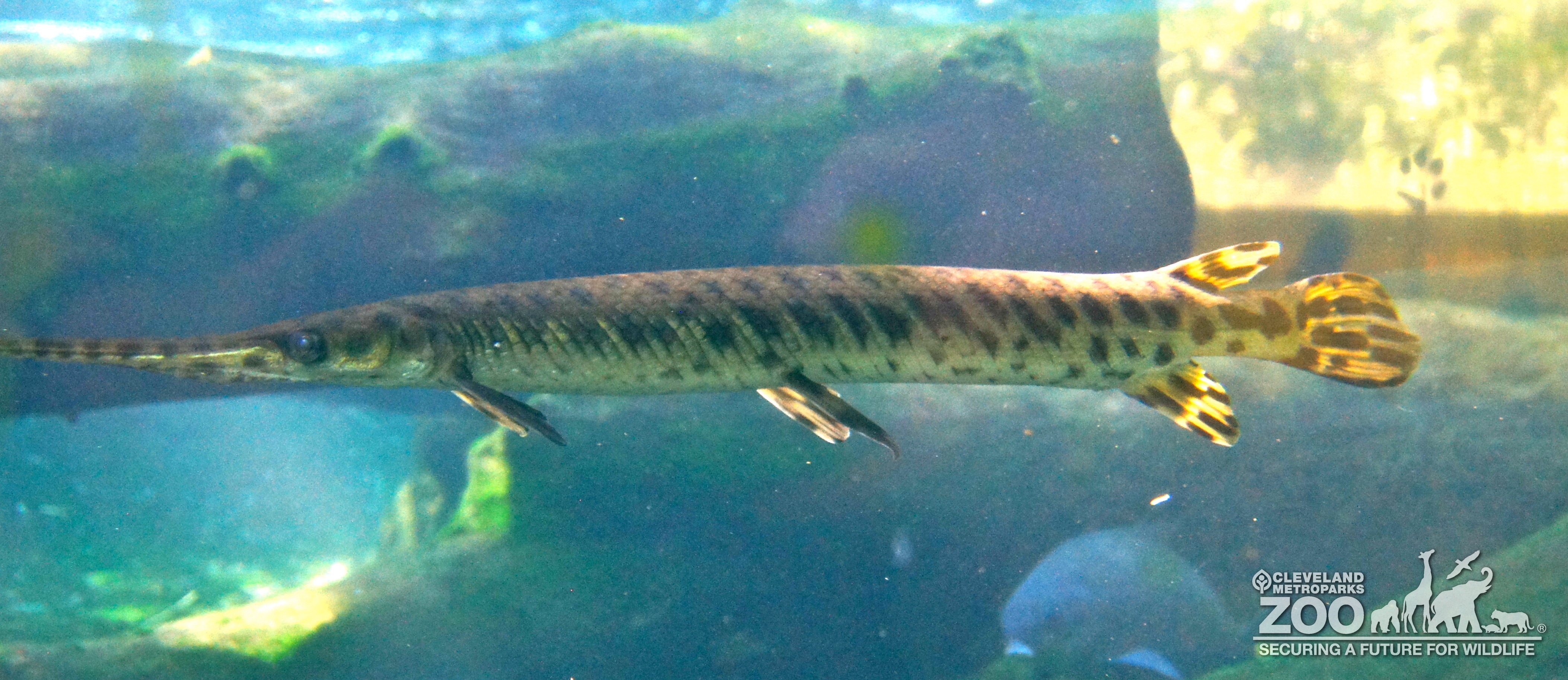 The fish is swimming in water with other fish nearby. The Longnose Gar has a long and narrow nose and body. The body of the fish is covered with dark stripes and spots. There is yellow on it tail and back fins.