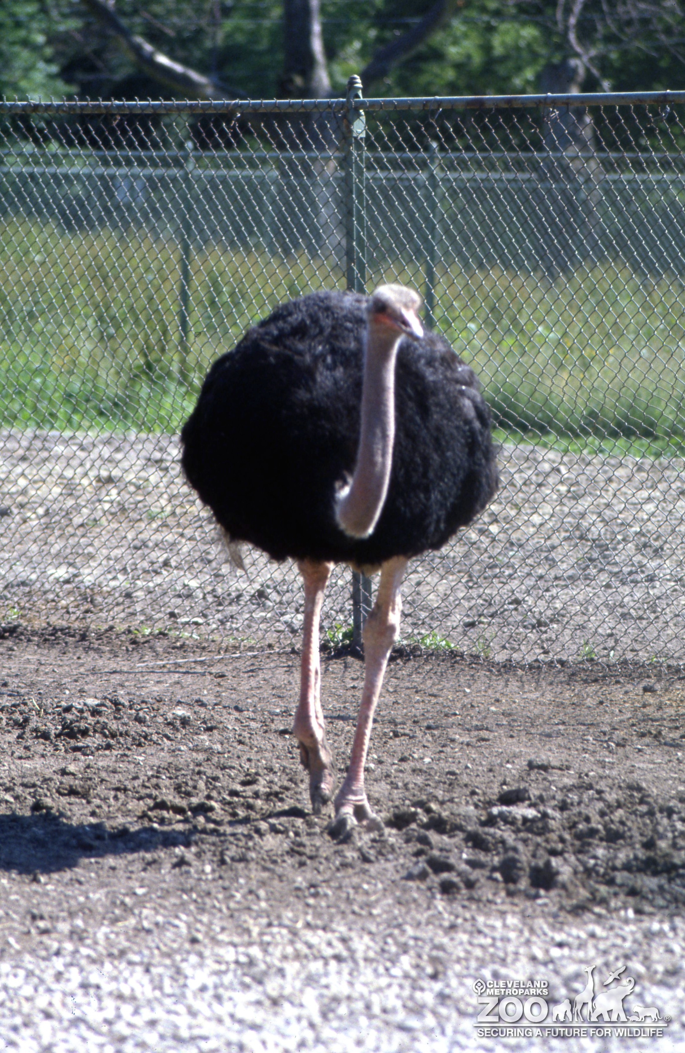 Ostrich walking outside in exhibit yard. Cyclone fence is in background. Large bird has long neck and legs.