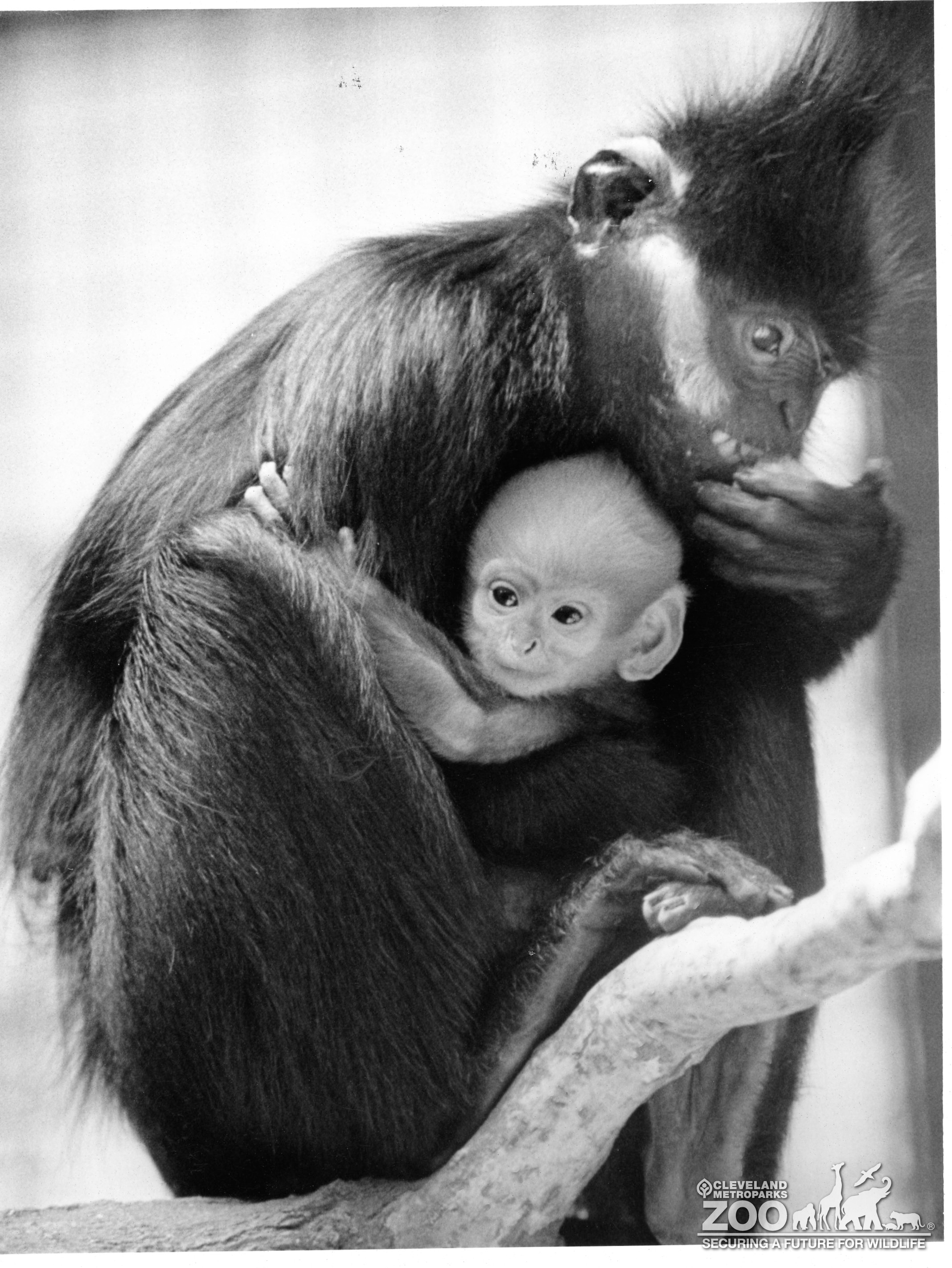 Black & white image of Francois langur with infant clinging to its chest. They are sitting on a branch in The RainForest. Infant is looking outward while holding tight the adults long black fur.