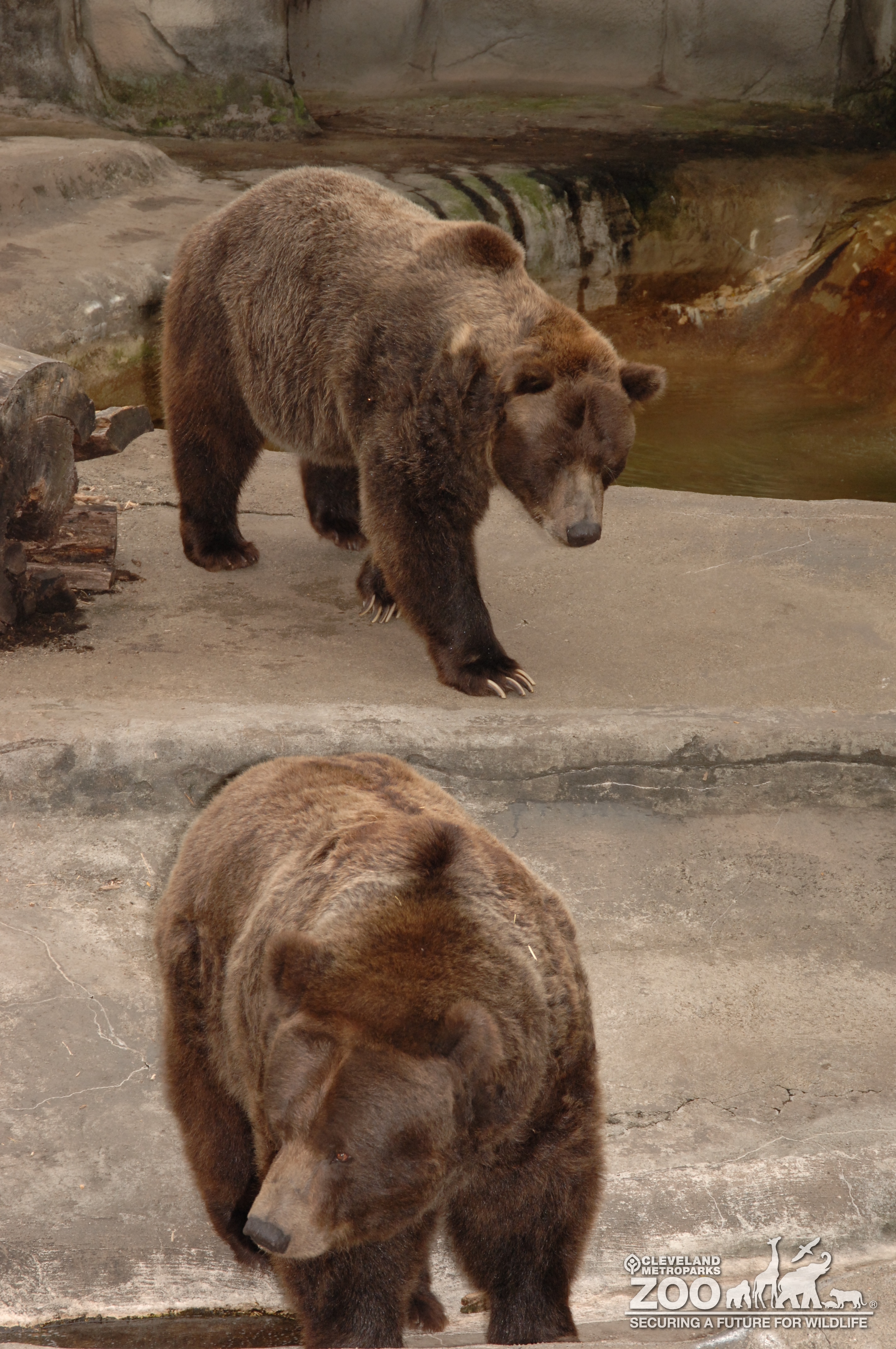 This photo features two Grizzly Bears walking through their outdoor enclosure. The bear in the front is close to the camera looking off to the right while the bear in the back is next to an empty concrete pond moving off to the left. Both bears are covered in reddish brown fur with some patches of greyish blond fur.
