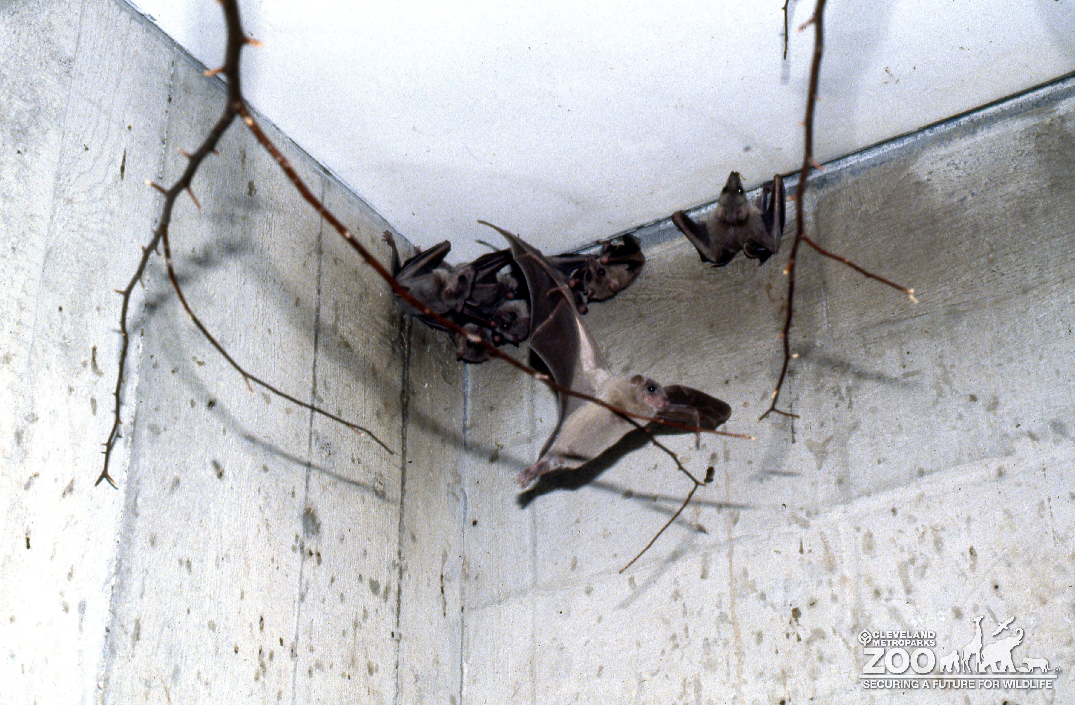This photo features multiple Egyptian Fruit Bats hanging upside down from the corner of the ceiling of a grey concrete enclosure above a few small tree branches. One of the bats has dropped down from the corner and is flying away from the other bats. The bat's black wings are fully extended and it's head and lower body are visible beneath it's wing span.